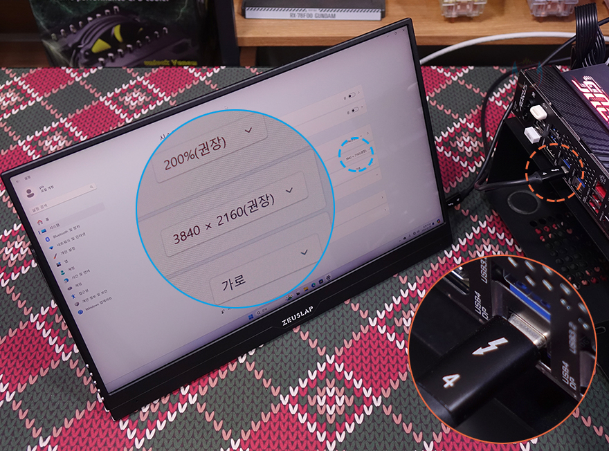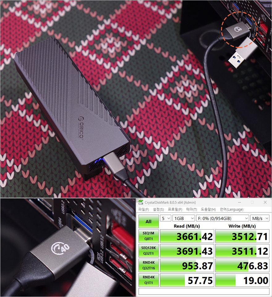 끝으로, B650E AORUS PRO X USB4 메인보드의 가장 큰 특징이라 할 수 있는 USB 4.0 지원을 확인해 보는데, 앞서 언급했듯이 백패널 I/O 포트에 위치한 2개의 USB 4.0 포트는 데이터 전송과 모니터 출력 2가지 기능을 지원합니다. 특히, 먼저 출시했던 B650E AORUS Elite X AX ICE는 라이젠 8000 시리즈 CPU를 사용해야하는 제한된 조건이 있었지만, B650E AORUS PRO X USB4는 CPU 종류 상관없이 사용할 수 있다라는 점이 소비자입장에서 매우 반갑죠. 물론, 썬더볼트4를 지원하는 것은 아니지만, USB 4.0 규격이라 썬더볼트3까지는 호환이 됩니다. 실제로 백패널 I/O에 배치된 USB 4.0 포트를 통해 사용해보면, USB 4.0 지원의 외장 SSD를 사용하면 기존에 가장 빨랐던 USB 3.2 Gen2x2보다 더 빠른 속도로 데이터 전송을 할 수 있고, 모니터 출력 같은 경우에도 USB Type-C 케이블 하나로 썬더볼트 지원의 모니터와 연결해서 사용할 수 있는데 앞서 언급했듯이 최대 4K(3840x2160) 해상도까지 지원하죠. 참고로, USB 4.0을 제대로 사용하기 위해서는 윈도우 11 23H2 버전이상의 운영체제를 사용해야 합니다.