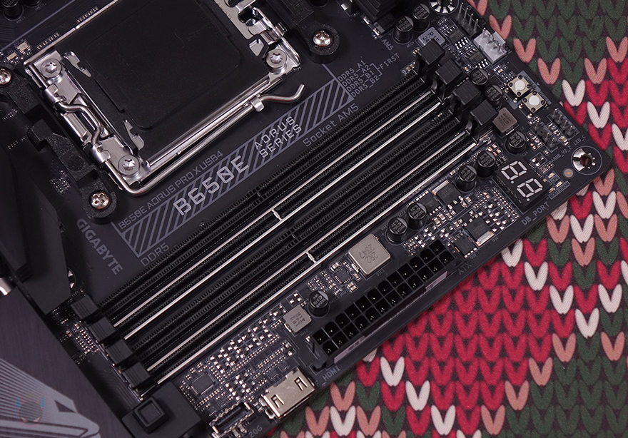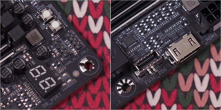 메모리 슬롯은 4개 구성으로 DDR5 지원을 하며, 듀얼 채널 장착시 기본 슬롯인 2번(A2)과 4번(B2) 자리에는 스틸 아머 디자인을 적용해 내구성을 좀 더 강화했습니다. 참고로, 용량은 논-바이너리까지 지원해 최대 192GB까지 지원하며, 클럭 역시 8000 MHz이상의 높은 클럭까지 지원합니다. 또한, 메모리슬롯 주변에는 온보드 전원과 리셋 버튼이 배치되어 있으며, 12V RGB와 5V ARGB 헤더, 디버그 LED도 적용되어 있죠. 또한, 슬롯 앞쪽 자리에는 USB 3.2 Gen2x2 타입 C 헤더와 외부 모니터로 시스템 상태를 모니터링할 수 있는 Sensor panel Link 지원의 HDMI 포트가 배치되어 있습니다.