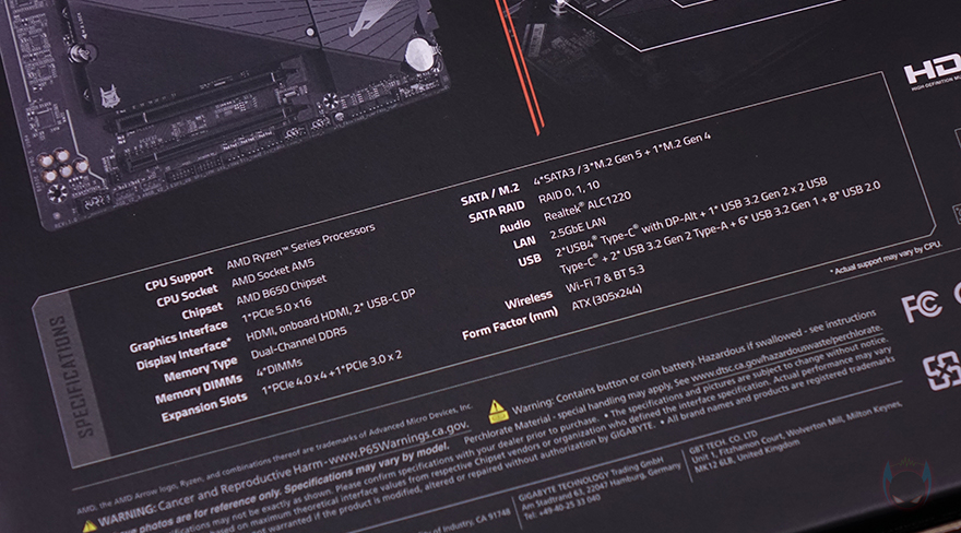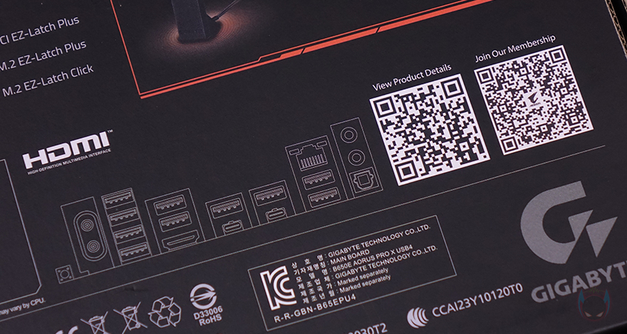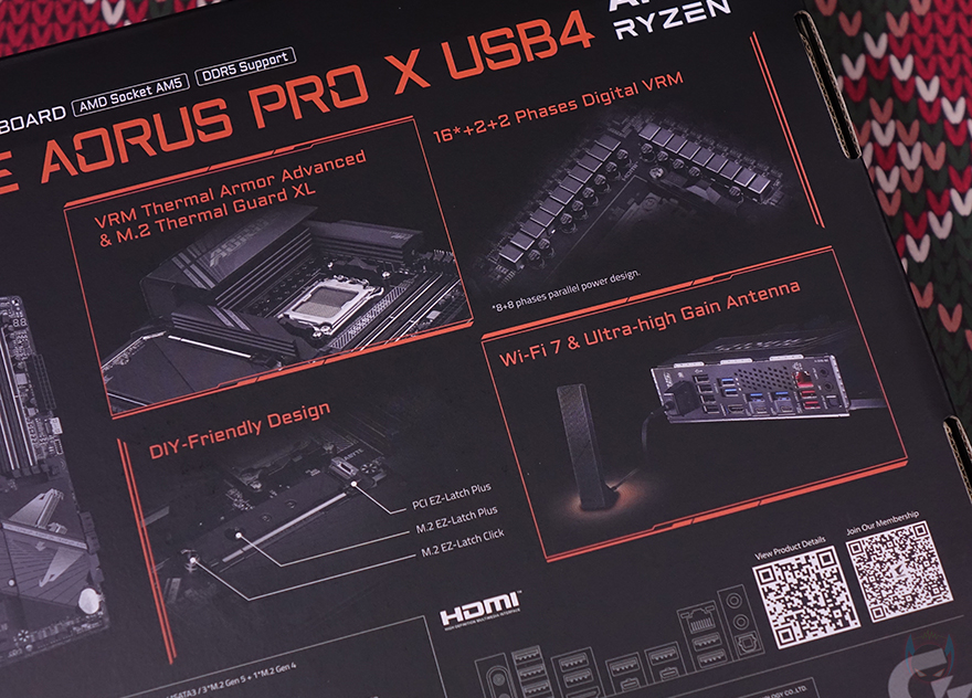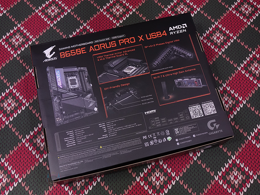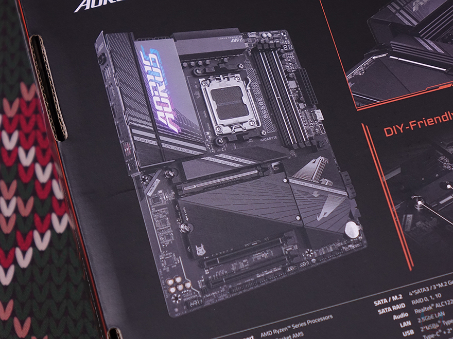 제품 패키지는 최근 기가바이트 어로스 제품들과 마찬가지로 박스 전면에 큼지막한 어로스 로고와 모델명, 그리고 AMD B650E 칩셋 표기를 확인할 수 있습니다. 박스 후면에는 한쪽에 제품 풀샷 이미지를 담고 있어서 메인보드 레이아웃 디자인을 간접적으로 먼저 확인할 수 있으며, 바로 옆에는 제품 주요 특징으로 전원부와 M.2 슬롯 쿨링 구성, 전원부 구성, EZ-Latch 편의성, 무선 Wi-Fi 7 기본 지원에 대한 언급을 담고 있습니다. 또한, 아래에 추가적으로 제품의 기본 사양 표기와 백패널 I/O 포트 구성 표기도 확인할 수 있죠.