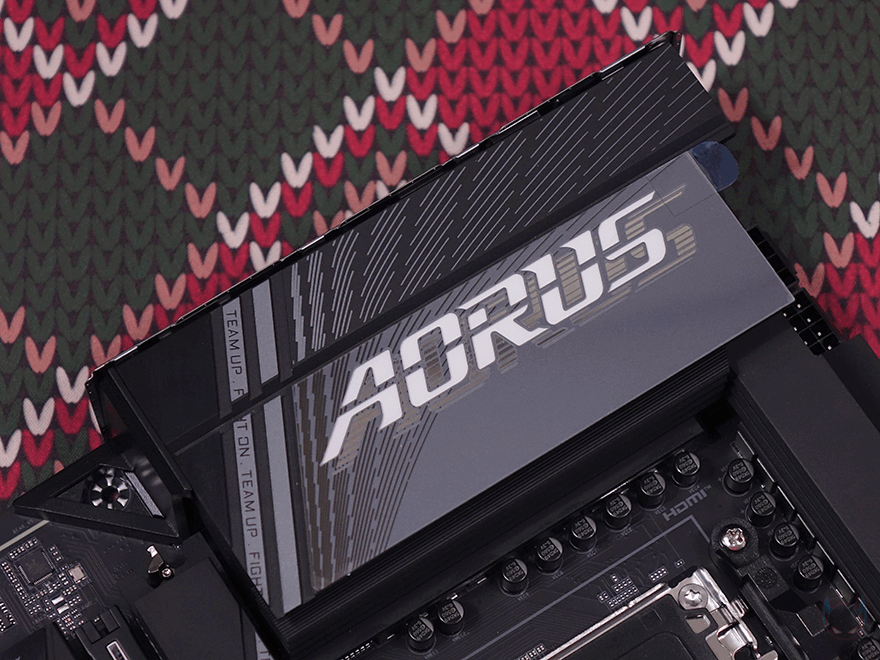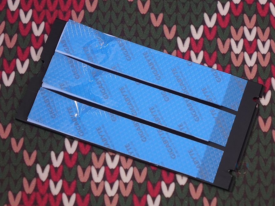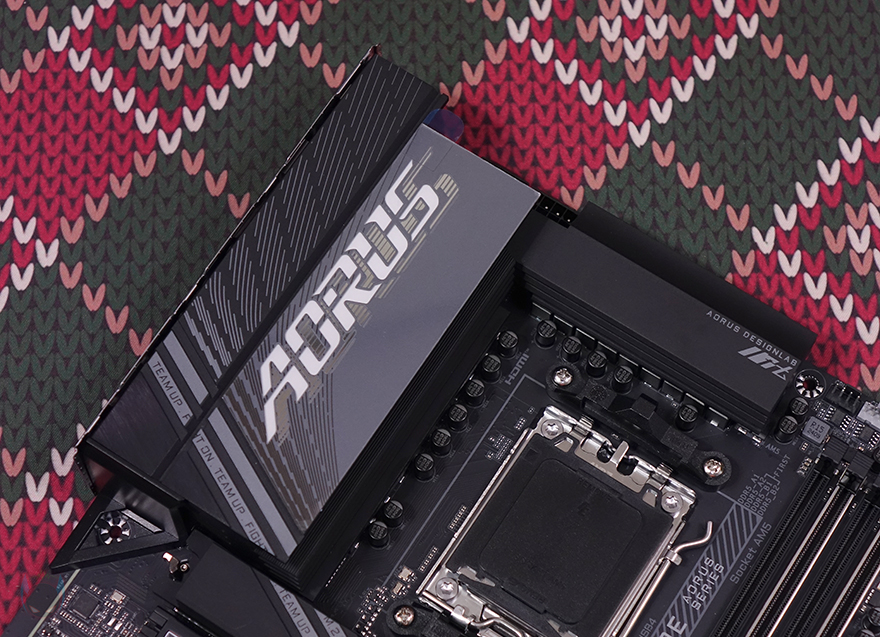그럼, 본격적으로 기가바이트 B650E AORUS PRO X USB4 메인보드 레이아웃을 살펴보는데, 전체적인 디자인 색상 계열은 블랙이며, 엘리트보다 한 단계 상위 모델답게 큰 면적의 히트싱크들이 곳곳에 적용되어 있습니다. 좀 더 자세히 살펴보면, 가장 먼저 눈에 띄는 부분은 전원부 부분으로 큼지막한 히트싱크에 AORUS 로고를 새겨놨는데, 개봉 시에는 보호비닐이 부착되어 있습니다. 또한, 전원부 히트싱크를 분리해 보면, 안쪽에 전원부 모스펫과 초크 부분에 발열해결을 위해 써멀패드가 기본 부착된 것을 확인할 수 있으며, AORUS 로고 부분에는 RGB 라이트효과를 볼 수 있게 별도의 LED 기판이 적용된 것을 확인할 수 있죠. 또한, 전원부 2개의 히트싱크 사이로는 지름 6mm 히트파이트까지 적용된 것을 확인할 수 있습니다.
