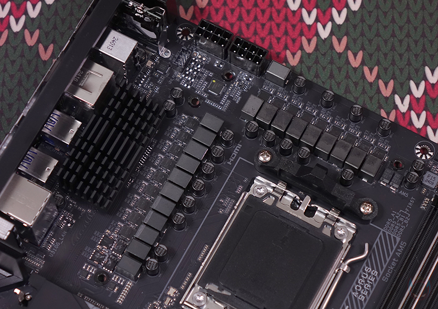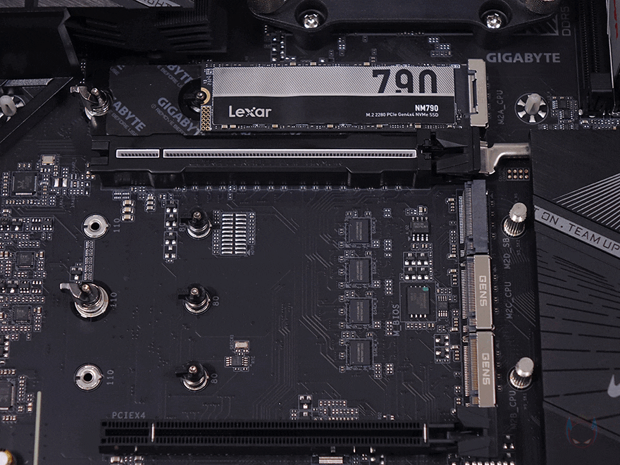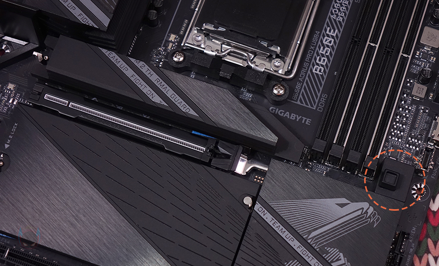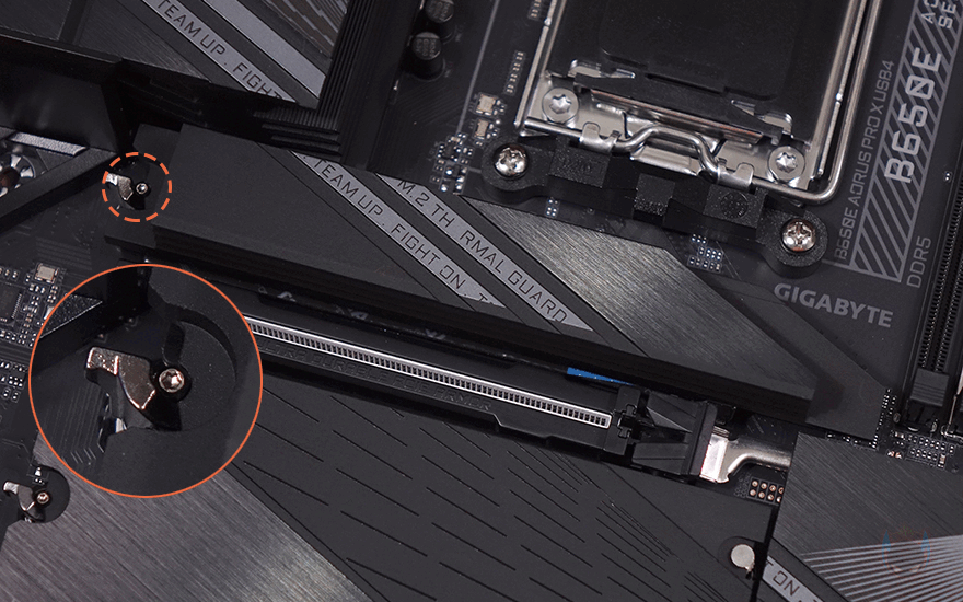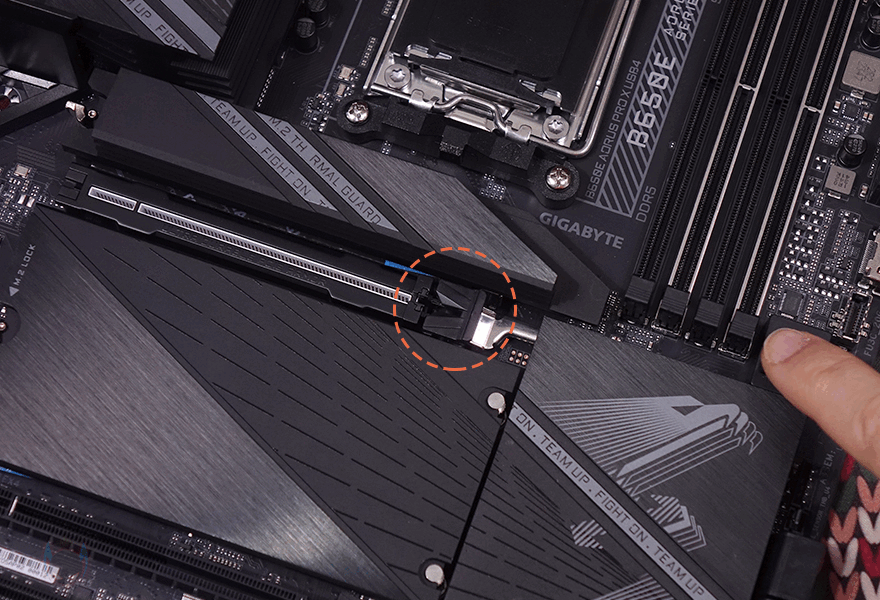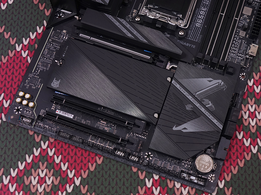 그리고, 1번 PCIe 슬롯 바로 위에는 M.2 SSD 슬롯 1번이 배치되어 있는데, 기본 히트싱크가 장착되어 있으며, 무나사 방식의 EZ-Latch Plus가 역시 적용되어서 쉽게 히트싱크를 분리/장착할 수 있고, SSD 장착 역시 무나사 방식의 EZ-Latch Plus를 적용하고 있습니다. 참고로, SSD 규격은 라이젠 8000 시리즈 CPU 사용시 PCIe 4.0x4까지 지원하며, 라이젠 7000시리즈 CPU 사용 시에는 PCIe 5.0x4까지 지원합니다. 또한, 1번 SSD 슬롯 자리에는 히트싱크 안쪽에 써멀패드가 기본 부착되어 있고, SSD 후면에 해당되는 EZ-Latch Plus 위치에도 써멀패드가 부착되어 있죠. 그리고, 1번 PCIe 슬롯 아래에는 추가 M.2 SSD 슬롯 자리로 널찍하게 역시 히트싱크가 장착되어 있으며, 역시 EZ-Latch Plus가 적용되어 무나사 방식으로 히트싱크를 분리/장착할 수 있으며, 추가 M.2 SSD 슬롯은 총 3개 구성에 각 슬롯마다 역시 EZ-Latch Plus가 적용되어 무나사 방식으로 SSD를 장착할 수 있습니다. 물론, 히트싱크 안쪽에도 3개의 써멀패드가 기본 부착되어 있죠. 참고로, EZ-Latch Plus는 모두 2280 길이 사이즈 위치에 기본 장착되어 있으며, 22110 길이까지 장착할 수 있기 때문에 EZ-Latch Plus를 22100 위치로도 변경할 수 있습니다.