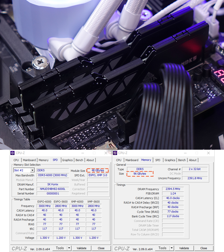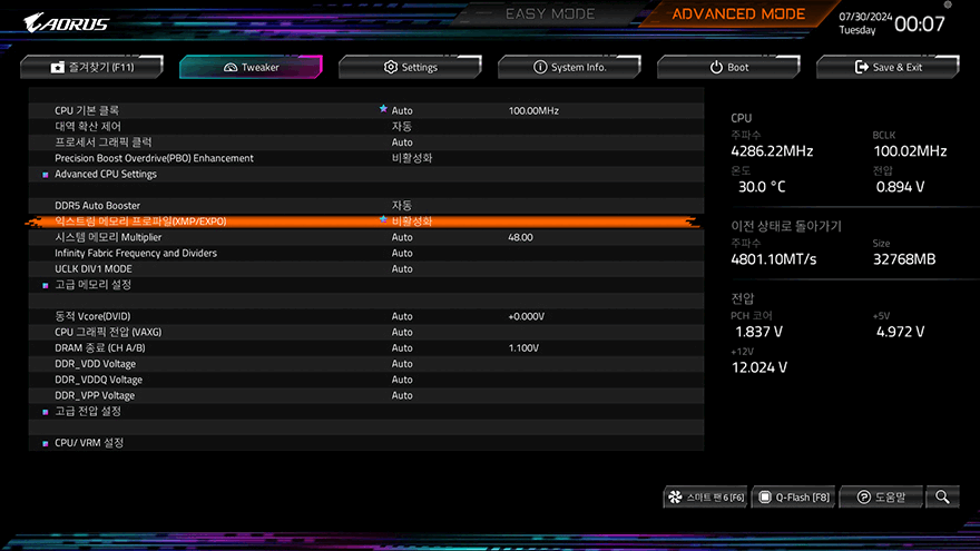 메모리 같은 경우도 CMOS→Tweaker 메뉴에서 수동적으로 클럭이나 전압 조절을 통해 오버클럭을 할 수 있지만, 요즘은 EXPO나 XMP 프로파일이 적용된 높은 클럭 제품들도 많기 때문에, 높은 클럭의 EXPO/XMP 프로파일 메모리를 사용한다면, 설정된 값을 불러와 한 번에 손쉽게 메모리 성능을 올릴 수 있습니다. 물론, 전원부도 어느 정도 뒷받침 되어야 하기 때문에 B650E AORUS PRO X USB4 메인보드에선 충분히 소화를 해주죠. 또한, 앞서 언급했듯이 DDR5 메모리부터 생겨난 24GB, 48GB의 논-바이너리 메모리도 완벽하게 인식 지원해주고 있어서 대용량 메모리 구성도 걱정 없습니다.