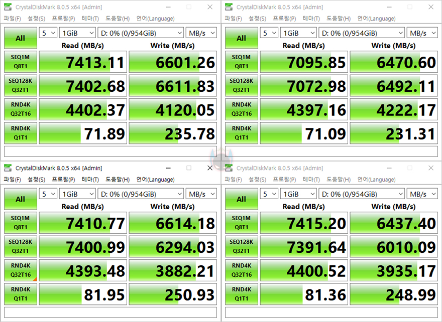 SSD 지원 같은 경우 앞서 확인했듯이 총 4개의 M.2 SSD 슬롯을 갖추고 있습니다. AMD CPU 사용에 따라 일부 M.2 SSD 슬롯은 PCIe 5.0x4 규격까지 지원하는데, 아직 PCIe 5.0 SSD는 소비자에게 부담되는 가격이라 현재 가장 많이 선택하는 PCIe 4.0x4 규격으로 4개의 슬롯에 장착해 읽기와 쓰기 속도를 확인해 봤습니다. PCIe 4.0x4 규격이면 일반적으로 최대 7000MB/s대의 읽기와 최대 6500MB/s대의 쓰기 속도를 보여주는데, B650E AORUS PRO X USB4 메인보드 M.2 SSD 슬롯 모두 최대 속도로 발휘되는 걸 확인할 수 있죠.