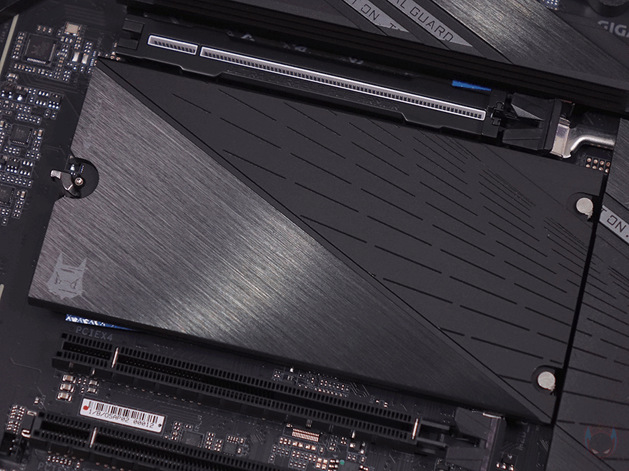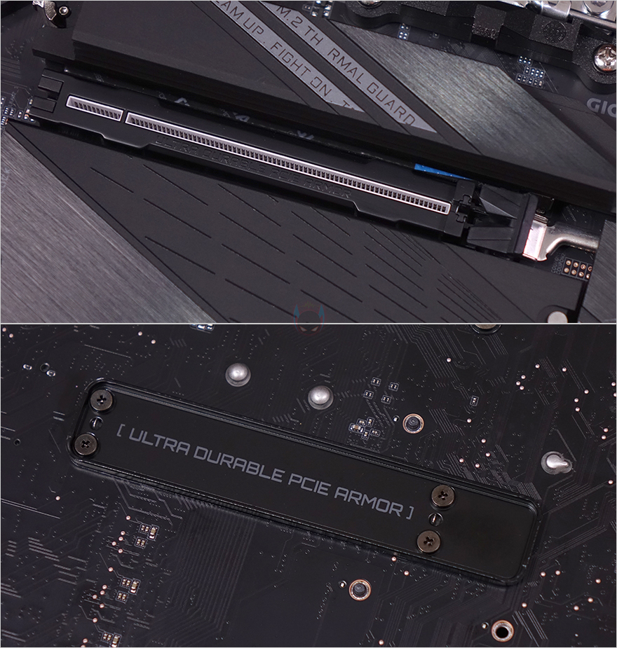 PCIe 슬롯은 총 3개를 구성하고 있으며, 그래픽카드가 장착되는 1번 PCIe 슬롯은 같은 위치 메인보드 맨 오른쪽에 그래픽카드를 쉽게 분리할 수 있도록 EZ-Latch Plus 장치를 적용했습니다. 또한, 슬롯 스크래치 방치를 위해 내부에는 고무스트립을 외부 표면에는 스틸 아머 디자인을 적용했는데, 그래픽카드 무게 하중도 충분히 견딜 수 있도록 후면에 백플레이트까지 적용되어 있죠.