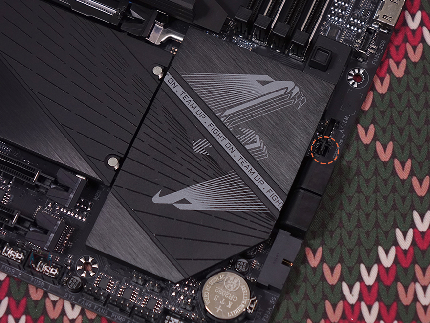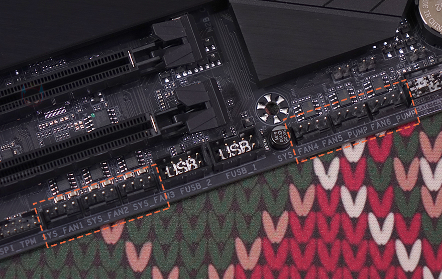 AMD B650E 메인칩셋 자리에는 어로스 로고가 새겨진 히트싱크가 장착되어 있으며, 오른쪽 측면 메인보드 맨 가장자리에는 S-ATA 커넥터 옆에 앞서 구성품에서 확인한 소음 감지 케이블과 연결되는 커넥터가 적용되어 있습니다. S-ATA 커넥터는 총 4개를 구성하고 있으며, 바로 옆에는 USB 3.2 Gen1 내부헤더도 배치되어 있죠. 그리고, 메인보드 맨 아래 가장자리에는 CPU 팬 커넥터 외에 시스템 팬 커넥터 6개가 3개씩 일렬로 배치된 것을 확인할 수 있으며, 메인보드 맨 왼쪽부분은 내장 오디오 부분으로 독립 PCB 구간처리에 리얼텍(Realtek) 칩셋을 사용했습니다.