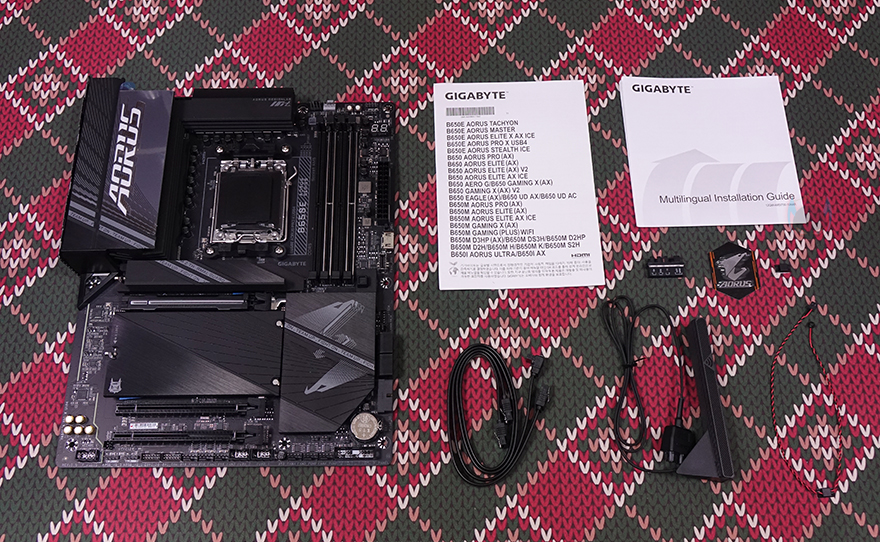 박스를 열어 제품 포장 및 구성품을 확인해보면, 메인보드는 정전기방지 비닐 포장으로 처리되어 있으며, 메인보드 아래 공간에 나머지 구성품들이 있는데, B650E AORUS PRO X USB4 메인보드 비롯해, 안내서, 설치가이드, SATA 케이블 2개, 무선 Wi-Fi 안테나, G-커넥터, 소음 감지 케이블, 로고 스티커 제공으로 이루어져 있습니다.