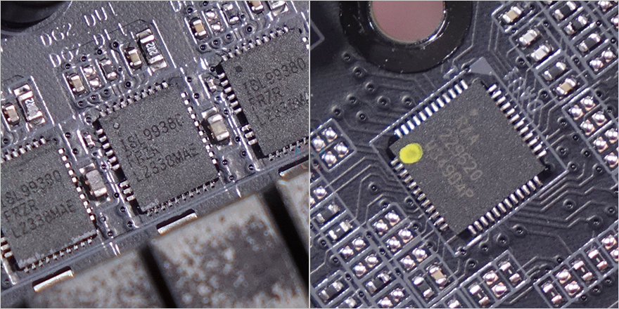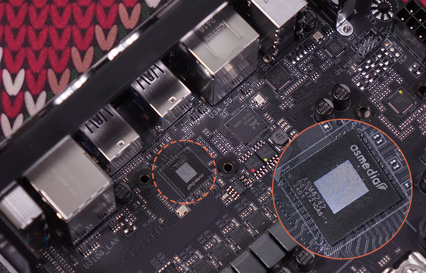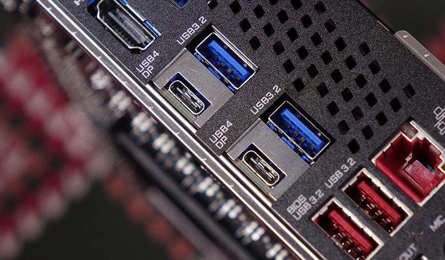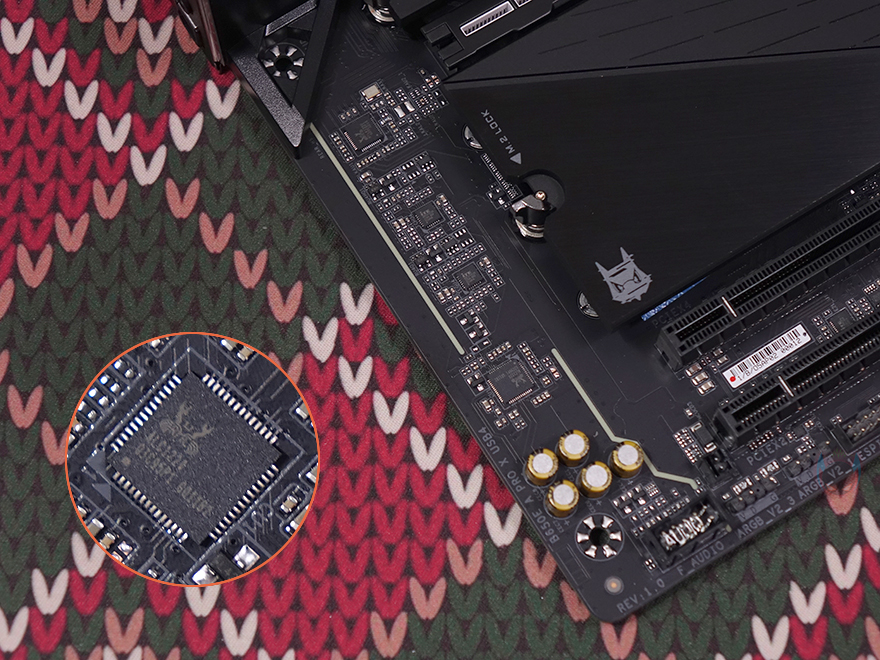 전원부는 16+2+2 페이즈로 총 20페이즈 구성을 하고 있으며, 모스펫과 전원부 컨트롤러 칩셋은 모두 Renesas Electronics 사 제품이며, 디지털 전원부 방식입니다. 또한, 모스펫 개당 80A 전력공급을 지원하고 있어서 엘리트보다 한 단계 상위 모델임에도 그 이상 상위 모델 부럽지 않게 전원부를 갖추고 있어서 하이엔드 CPU도 충분히 뒷받침해 줄 수 있죠. 또한, 백패널 방향 쪽에는 추가로 히트싱크가 하나 더 장착된 것을 확인할 수 있는데, 바로 USB 4.0 지원을 위한 칩셋 자리로 USB 4.0 규격상 고-대역폭을 지원하기 때문에 칩셋 발열해결을 위해 장착된 거죠. 참고로, USB 4.0 칩셋은 현재 외장 저장장치에서도 가장 많이 사용되는 asmedia사 칩셋입니다.
