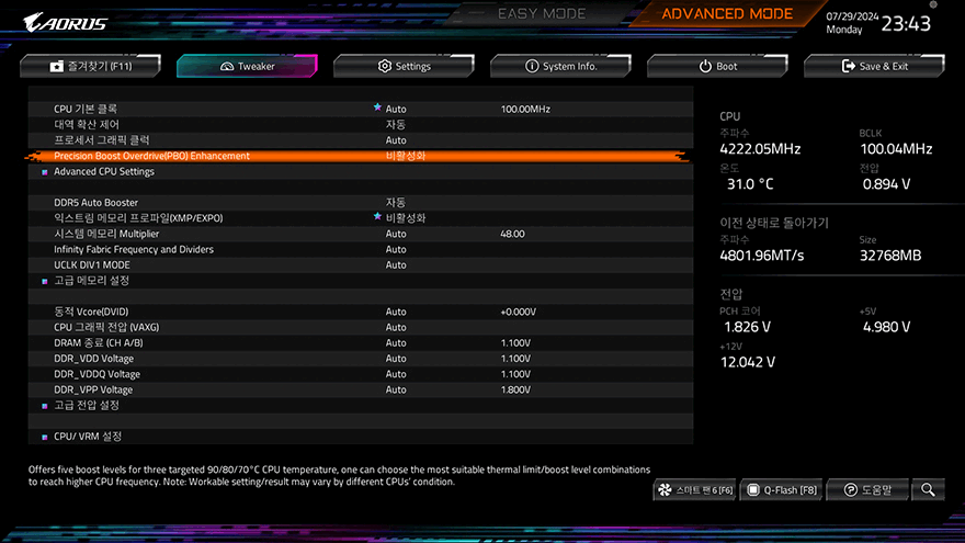 그럼, B650E AORUS PRO X USB4 메인보드에서 지원하는 기능들을 부품별 하드웨어로 살펴보면, 먼저 CPU 같은 경우 AMD B650E 칩셋 기반이기 때문에 CPU와 메모리 오버클럭을 지원합니다. CPU와 메모리 성능을 올릴 수 있는 오버클럭 설정은 CMOS→Tweaker 메뉴에서 다룰 수 있는데, 다만 요즘 AMD CPU 같은 경우에는 수동적인 오버클럭 메뉴보다 커브옵티마이저 메뉴로 설정해서 사용하는 경우가 더 많고, 이 제품 역시 커브옵티마이저 메뉴를 갖추고 있죠. 물론, 커브옵티마이저 설정 역시 CPU 성능을 최적으로 발휘하기 때문에 쿨링 성능이 뒷받침되어야 합니다.