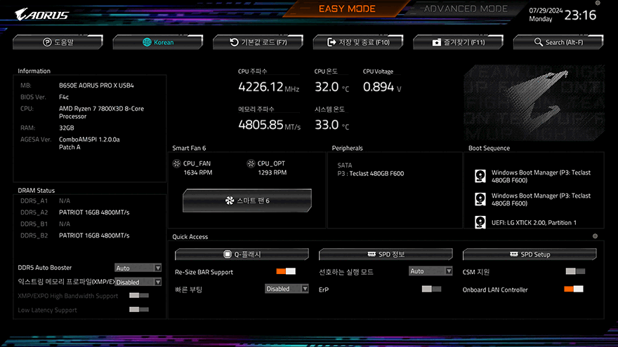 기가바이트 B650E AORUS PRO X USB4 메인보드를 사용해보면, 일단 메인보드에 전원이 들어오면 전원부 쪽 히트싱크의 AORUS 로고 부분과 B650E 메인칩셋 자리의 히트싱크 아래쪽에 LED 즉 RGB 라이트 효과를 확인할 수 있습니다. 물론, 기가바이트의 RGB Fusion 2.0으로 작동되기 때문에 다양한 모드 전환을 할 수 있습니다. 그리고, 바이오스인 CMOS 메뉴를 잠깐 살펴보면, 기존 기가바이트 어로스 메인보드 제품들과 마찬가지로 F2키를 통해 EASY 모드와 ADVANCED 모드 전환을 할 수 있으며, ADVANCED 모드에는 즐겨찾기/Tweaker/Settings/System Info/Boot/Save&Exit 크게 6가지 메뉴를 구성하고 있습니다. 메뉴 구성 역시 기존 제품들과 큰 차이가 없기 때문에 이미 기가바이트 메인보드를 사용해 본 이용자라면 익숙할 겁니다.