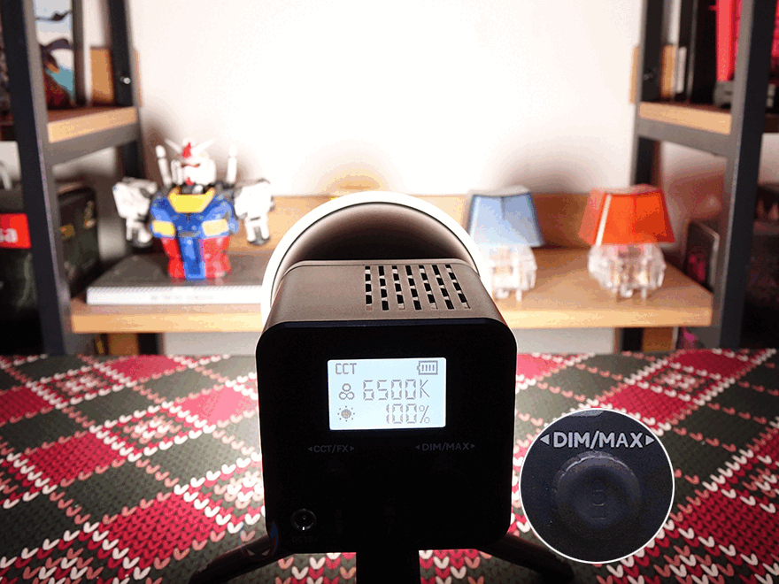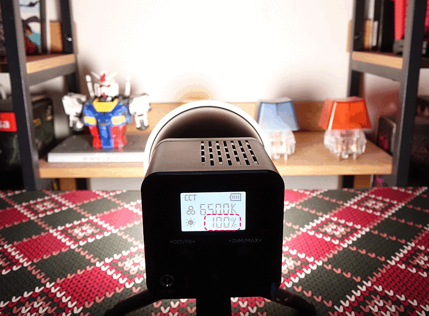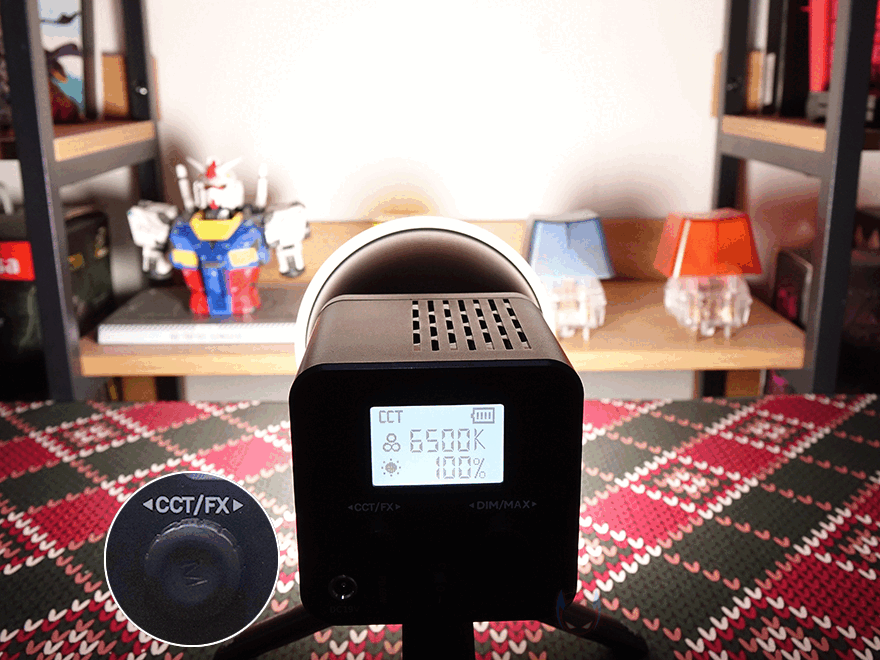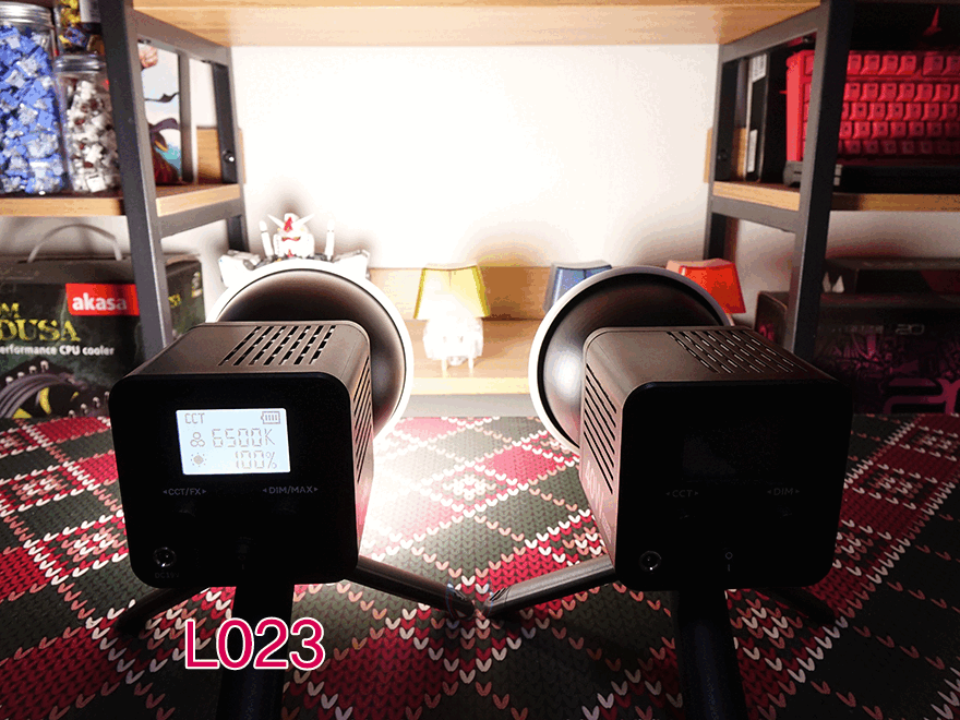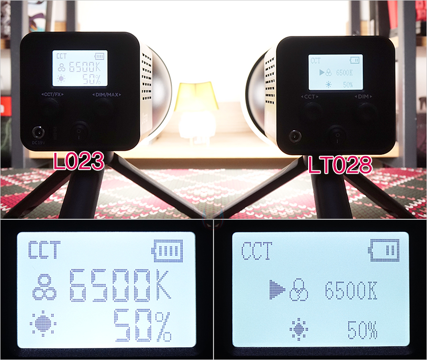그리고, L023(40W PRO) 역시 오른쪽 DIM 노브를 돌리면 밝기 조절을 1~100%까지 설정할 수 있으며, DIM 노브를 버튼처럼 누르면 에코(ECO) 모드로 바로 1% 밝기단계로 적용되죠. 이 부분 역시 이전 LT028 모델에선 없었던 기능으로 L023에서 좀 더 배터리 관리를 효율적으로 할 수 있게 되었습니다. 참고로, DIM 노브 역시 버튼 기능이 추가되면서 LT028에선 DIM 노브가 스무스하게 돌아가 정교한 단계설정이 조금 까다로웠지만, L023에선 CCT/FX 노브처럼 돌릴 때마다 걸리는 부분이 있어서 좀 더 쉽게 단계별 설정을 할 수 있게 되었습니다. 또한, DIM 노브를 2초 이상 누르고 있으면, Over모드(Mode)가 작동되는데, 바로 밝기조절을 최대 125%까지 올릴 수 있습니다. 그래서, 앞서 제품 사양표기에 L023의 최대 소비전력이 50W 즉 10W 더 늘어난 겁니다. 실제로 125% 밝기일 때 좀 더 밝은 차이는 느낄 수 있고, 100% 밝기일 때는 LT028과 동일하게 40W 전력이라 밝기 차이가 거의 동일합니다. 그리고, 왼쪽 CCT/FX 노브 역시 기능을 동일하게 돌리면 색온도조절로 2500K~6500K 범위에서 조절할 수 있으며, 버튼식으로 노브를 누르면 조명 모드 기능으로 역시 LT028과 동일하게 총 8가지 조명 모드를 제공해주고 있습니다.