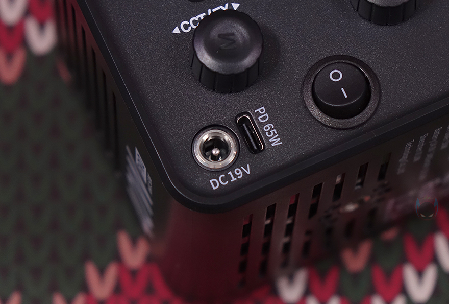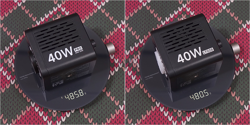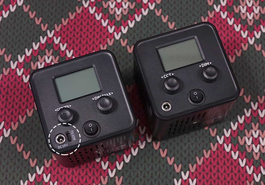 또한, 조명 본체 전면부 역시 동일하게 가운데 COB LED가 배치되어 있으며, 주변으로 발열해결을 위한 360˚ 방열판(Heatsink)이 적용되어 있습니다. 굳이 차이점이라면 COB LED 주변 라운딩부분의 색상이 블랙으로 바뀐 정도입니다. 그리고, L023 조명 본체 후면부 역시 1.77인치 크기의 디스플레이가 적용되어 있으며, 바로 아래에 왼쪽에는 색온도/모드(CCT/FX) 변경을 할 수 있는 노브, 오른쪽에는 밝기조절(DIM)의 노브가 배치되어 있습니다. 또한, 맨 아래에는 가운데 전원스위치가 배치되어 있으며, 스위치 옆 왼쪽에는 전원포트가 배치되어 있는데, 이 부분이 이전 모델 LT028과 가장 큰 차이점으로 L023에는 전원어댑터와 연결되는 포트 외에도 추가로 USB Type-C 포트가 추가되었죠. 이전 모델 LT028에서 가장 아쉬웠던 부분 중 하나가 바로 전원 지원으로 포터블 COB 제품인데 기왕이면 USB 타입으로 전원 및 충전할 수 있으면 더 좋다는 소비자들의 의견 많았는데, L023에서 바로 이 의견을 적용한 거죠. 그래서, L023에선 전원어댑터가 굳이 없어도 일반 65W USB 충전기를 사용해도 됩니다. 이렇게 USB 전원 및 충전 지원 포트가 추가되면서, L023과 LT028의 무게도 약간 차이가 있는데 L023이 5g 정도 더 나갑니다.