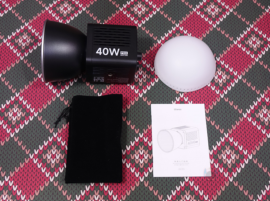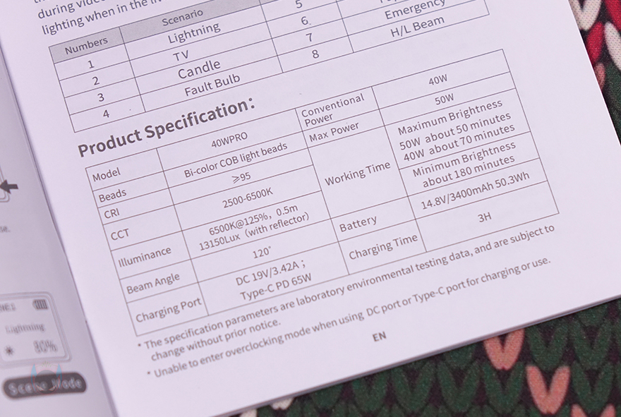 박스를 열어보면, 포장은 이전 제품과 마찬가지로 외부 충격방지를 위해 우레탄-폼 포장재를 사용했으며, 비닐포장도 함께 적용되었습니다. 그리고, 제품구성에는 L023 COB 조명, 디퓨저(Diffuser), 전용 파우치, 제품설명서로 이루어졌는데, 이전 모델 LT028에선 전원어댑터가 제공된 반면, 이번 L023모델에선 제외되었는데, 그 이유는 뒤에서 확인할 수 있습니다. 또한, 제품설명서에 제품의 기본 사양표기를 좀 더 자세히 확인할 수 있죠.