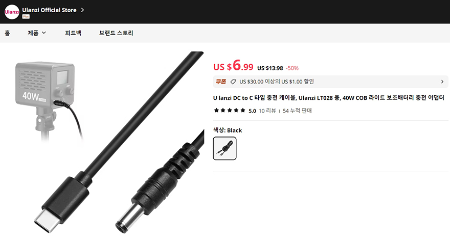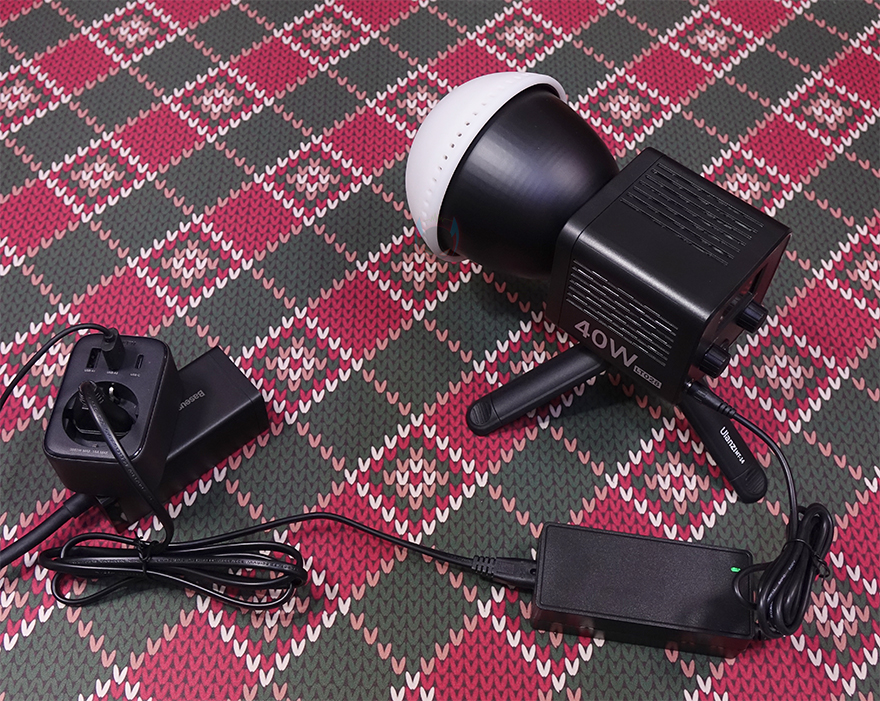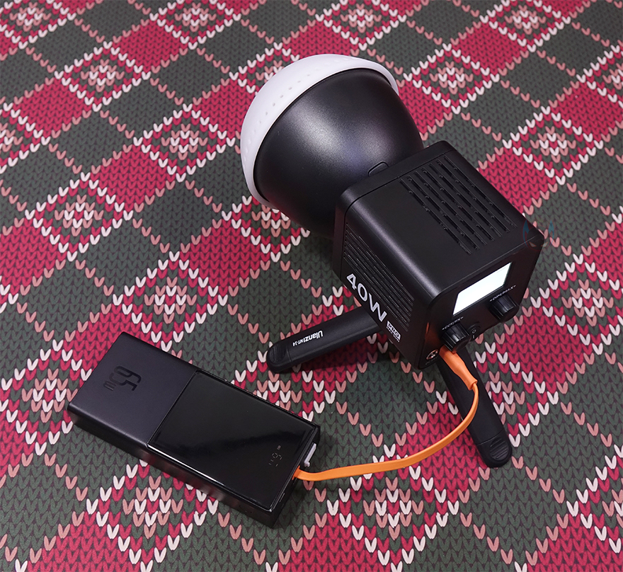 앞서 확인했듯이 이번 L023 모델과 이전 모델 LT028의 가장 큰 차이점은 전원 연결 지원입니다. 이전 LT028은 전원어댑터와 연결되는 DC 포트만 있어기때문에 내장된 배터리가 다 소모되면 충전 및 충전 중 사용을 위해서 제공되는 전원어댑터가 꼭 필요했죠. 하지만, L023에선 최대 65W 지원의 USB Type-C 포트가 추가되면서 번거롭게 전원어댑터를 사용하지 않고, 65W 지원 보조배터리나 65W 고속충전기를 USB Type-C 케이블과 함께 연결해서 사용해 주면 됩니다. 이런 부분은 조명 휴대 시 부피를 줄이는데도 도움이 되죠. 물론, 이전 LT028에서도 65W 충전기나 보조배터리를 사용할 수 있게 별도로 DC to USB Type-C 케이블을 판매하고 있습니다. 참고로, L023에 전원어댑터를 추가 싶다면 구입 시 옵션에서 선택할 수 있습니다.