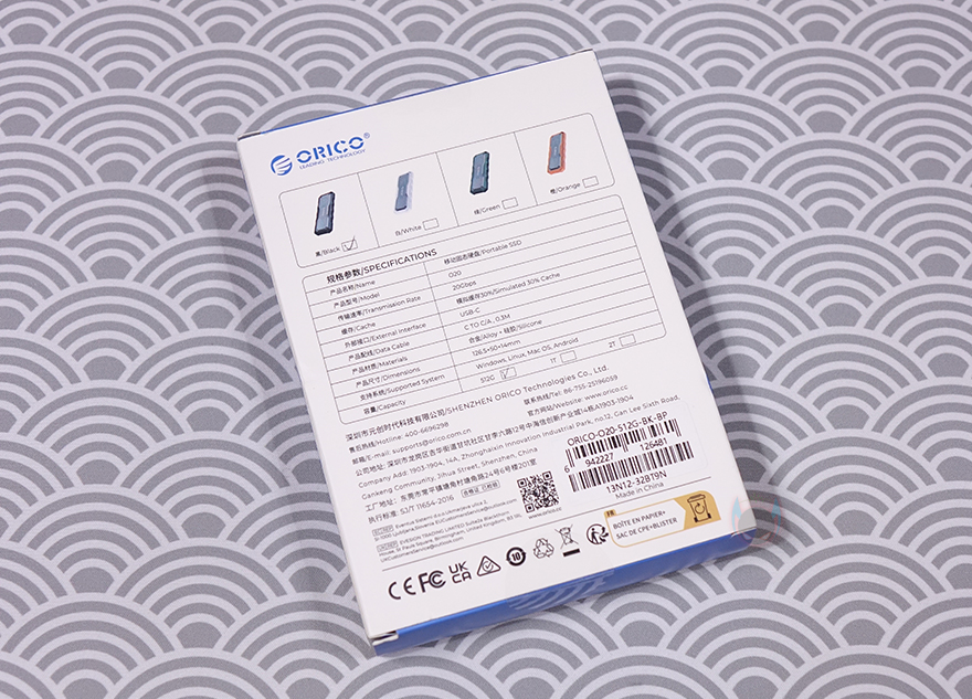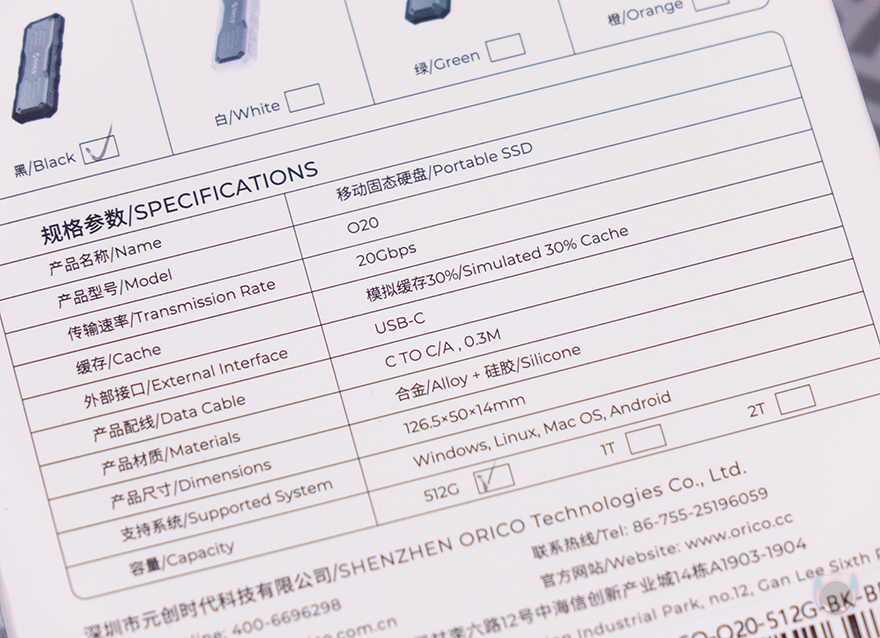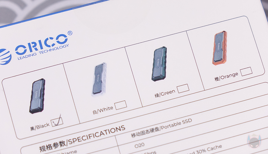 제품 패키지는 박스형태로 오리코의 다른 외장 저장장치 제품들처럼 역시 전면에는 제품 이미지를 담고 있으며, 제품명도 확인할 수 있습니다. 제품 이미지만 봐도 외부환경으로부터 보호하기 위한 디자인을 적용했다는 걸 짐작할 수 있죠. 박스 측면에는 제품의 주요 특징을 표기해 놨는데, 방진(Dustproof), 방수(Water Resistance), 충격방지(Shock Resistance), 전송속도 언급을 확인할 수 있습니다. 그리고, 박스 후면에는 제품 기본 사양을 확인할 수 있는데, Mecah O20 외장 SSD 색상 구분은 외부에 적용된 실리콘 패드에 따라 4가지 색상으로 구분된다라는 걸 확인할 수 있습니다. 그리고, 최대 속도는 20 Gbps 지원이고, 용량은 512GB, 1TB, 2TB 3가지로 출시되었죠.