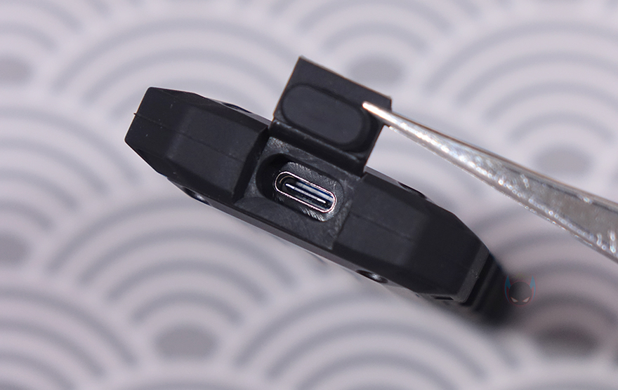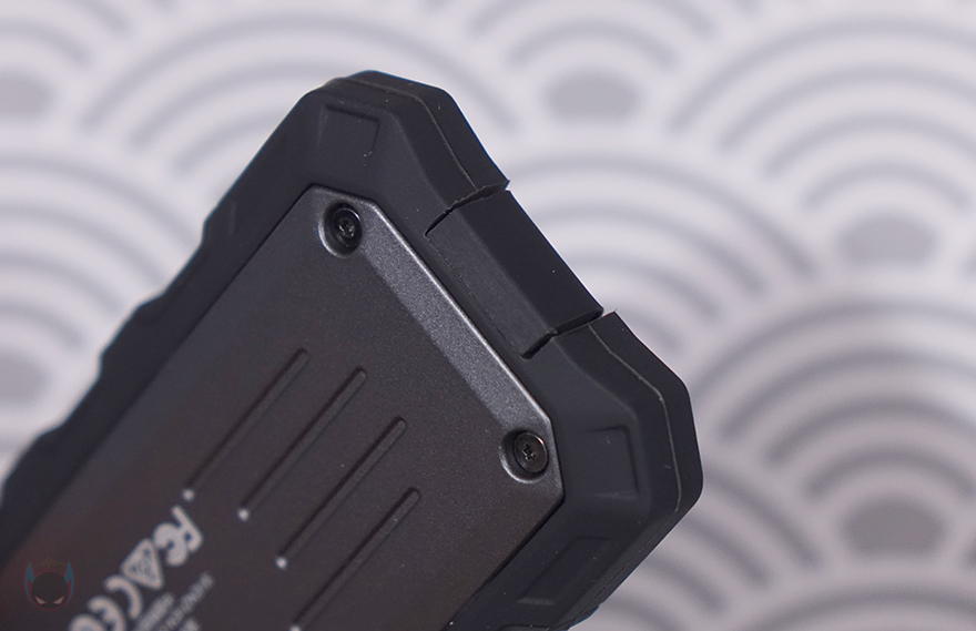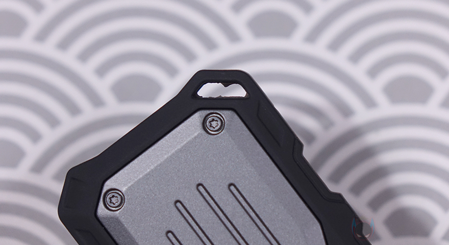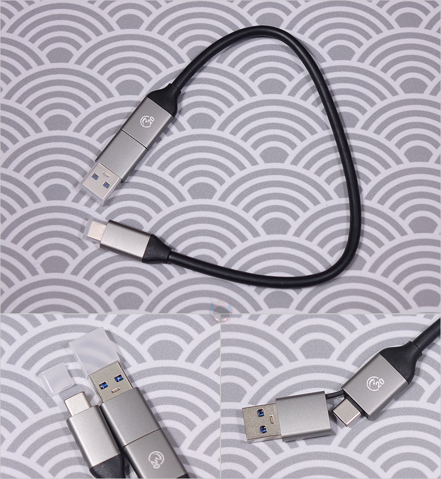 그리고, 케이스 한쪽 측면에는 USB 케이블과 연결되는 USB 포트가 배치되어 있는데, 역시 실리콘 패드에서부터 포트부분도 외부 환경으로부터 보호할 수 있게 커버(Cover)를 적용하고 있습니다. 특히, 커버를 열어보면, 포트가 바로 앞에 있는 게 아니라 안쪽으로 좀 더 들어간 상태인걸 확인할 수 있죠. 이는 외장 케이스를 방수/방진으로 보호할 때 가장 중요한 부분이 기기와 연결되는 포트 부분이기 때문입니다. 또한, 야외활동 시 휴대를 위해 백팩 등에 걸 수 있도록 고리 디자인도 적용되어 있죠. 함께 제공되는 USB 케이블은 총 30cm 길이에 한쪽은 USB Type-C 인터페이스, 나머지 한쪽은 젠더방식으로 USB Type-C&A 인터페이스를 가졌습니다. 케이블에 20이라는 숫자는 최대 전송속도 지원이 20 Gbps라는 걸 의미합니다.