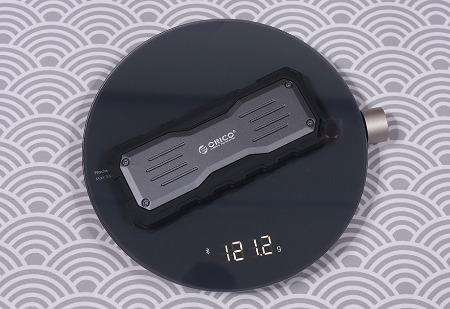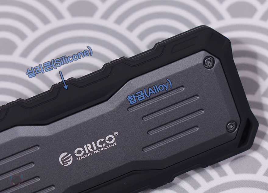 그럼, 본격적으로 오리코(ORICO)의 Mecha O20 외장 SSD를 살펴보면, 크기는 요즘 스마트폰보다 작은 사이즈를 가졌고, 무게도 약 120g으로 휴대하기에는 최적입니다. 그리고, 외장케이스 색상은 회색(Gray)이며, 케이스 주변으로 둘러싼 블랙(Black) 색상 부분은 실리콘(Silicone) 재질로 외부환경으로부터 보호할 수 있도록 했는데, 케이스 앞뒤 테두리 전체를 감싸고 있습니다. 참고로, 케이스 재질은 알루미늄 합금(Aluminum alloy)입니다.