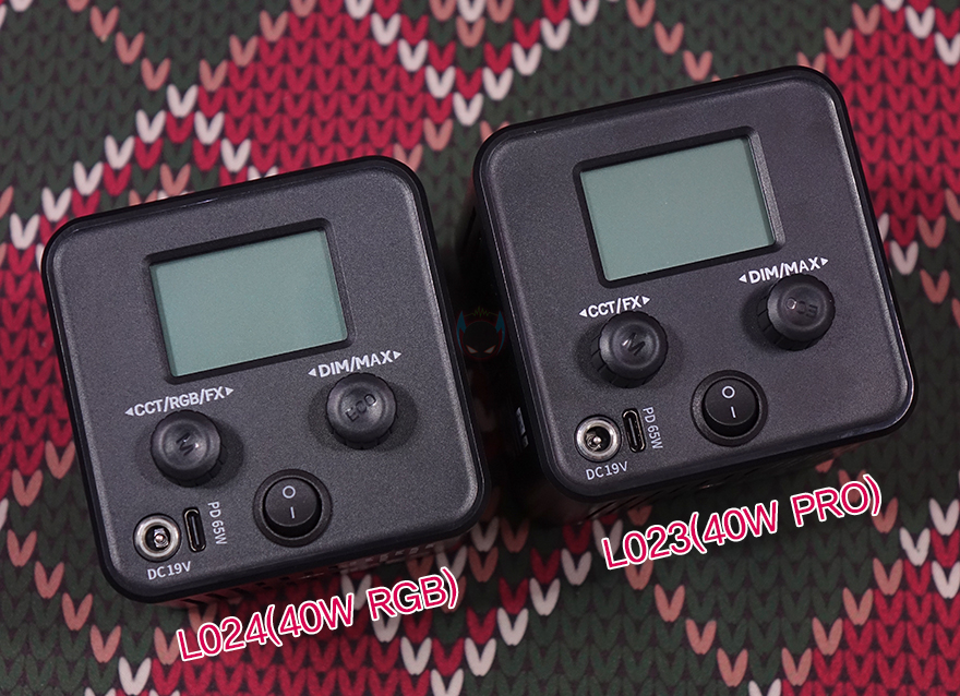 본체 하단에는 다시 한 번 제품 기본 사양 표기를 확인할 수 있으며, 가운데 부분에는 삼각대 장비 등에 연결할 수 있는 1/4" 인치 나사홀이 적용되어 있죠. 그리고, 본체 후면을 보면 이전 모델 L023(40W PRO)와 동일하게 1.77인치 디스플레이 적용을 비롯해, 2개의 노브(Knob), 전원 스위치, DC와 USB Type-C 전원 및 충전포트가 적용된 것을 확인할 수 있습니다. 다만, 왼쪽 노브(Knob)를 보면 바로 위 표기 부분에 RGB가 추가된 것을 확인할 수 있죠.