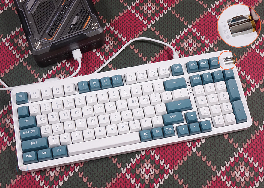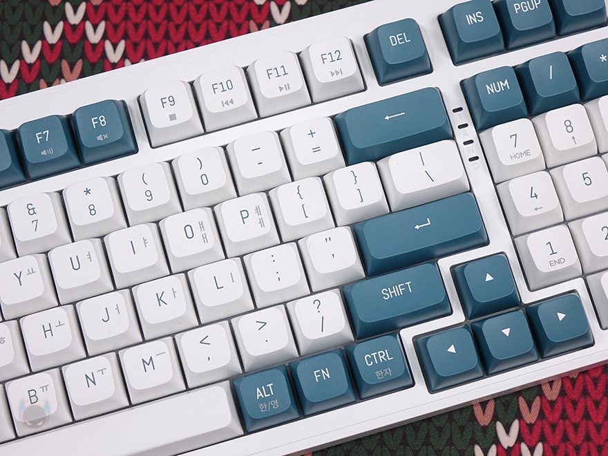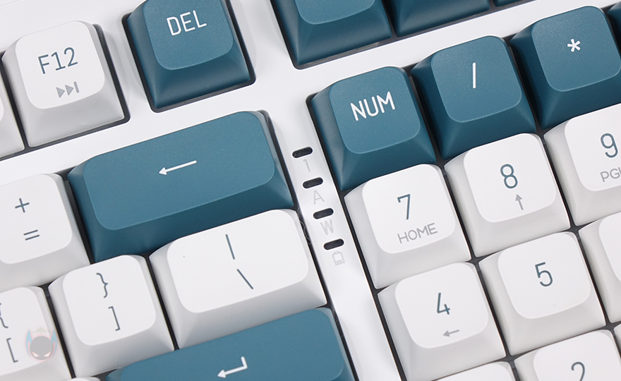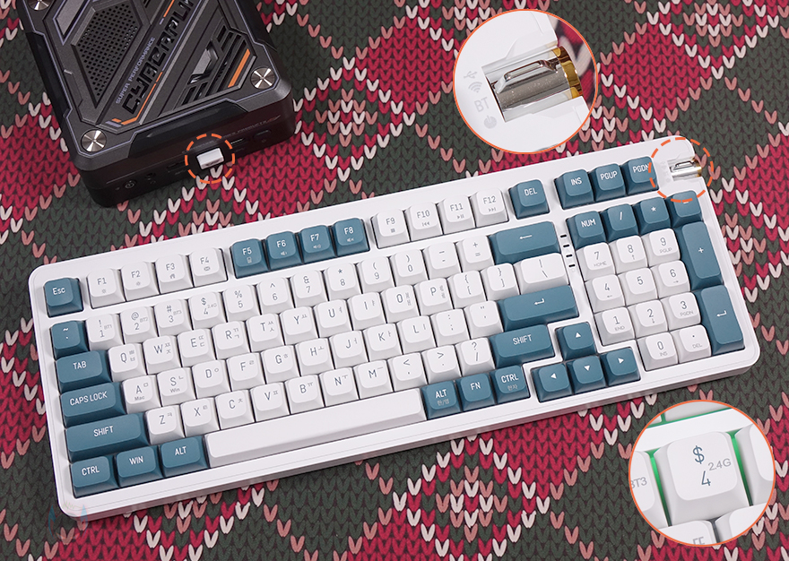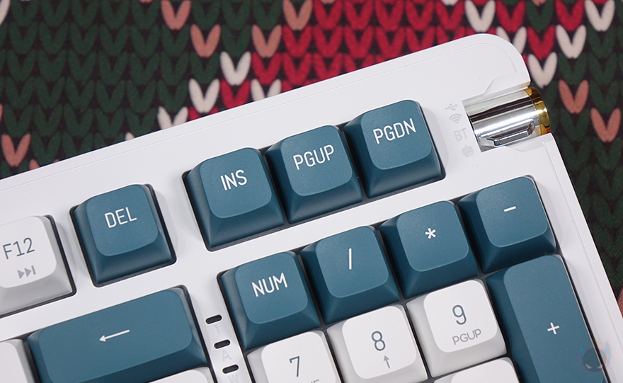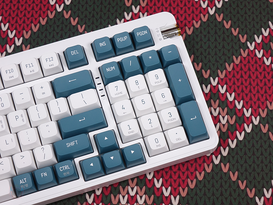 이런 100키이하인 96~98 키 배열의 특징은 키보드 오른쪽에서 쉽게 확인할 수 있죠. 맨 오른쪽에 배치되는 숫자키패드 바로 왼쪽에 배치되는 특수키 자리와 방향키 자리를 줄이면서 전체 키보드 사이즈가 들어듭니다. 그래서, DF98 키보드 역시 방향키를 오른쪽 쉬프트키 바로 옆에 배치하고, 숫자키패드 위에는 특수키 일부를 배치했죠. 여기에 특수키 자리 맨 오른쪽에는 레버형태의 노브가 배치되어 있는데, 바로 연결모드 전환 노브로 맨 아래 전원 Off부터 위로 한 단계씩 블루투스/무선 2.4G/유선 모드로 선택할 수 있습니다. 그리고, 숫자키패드와 백스페이스-바 사이에는 키 기능활성화 상태를 확인할 수 있는 LED 인디케이터가 배치되어 있죠.