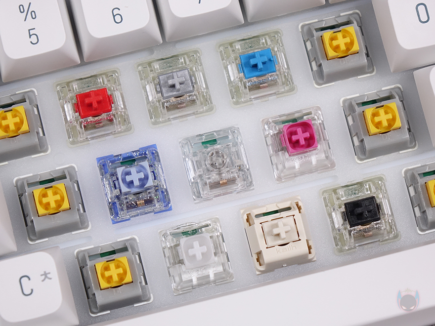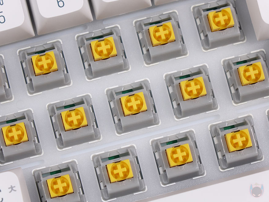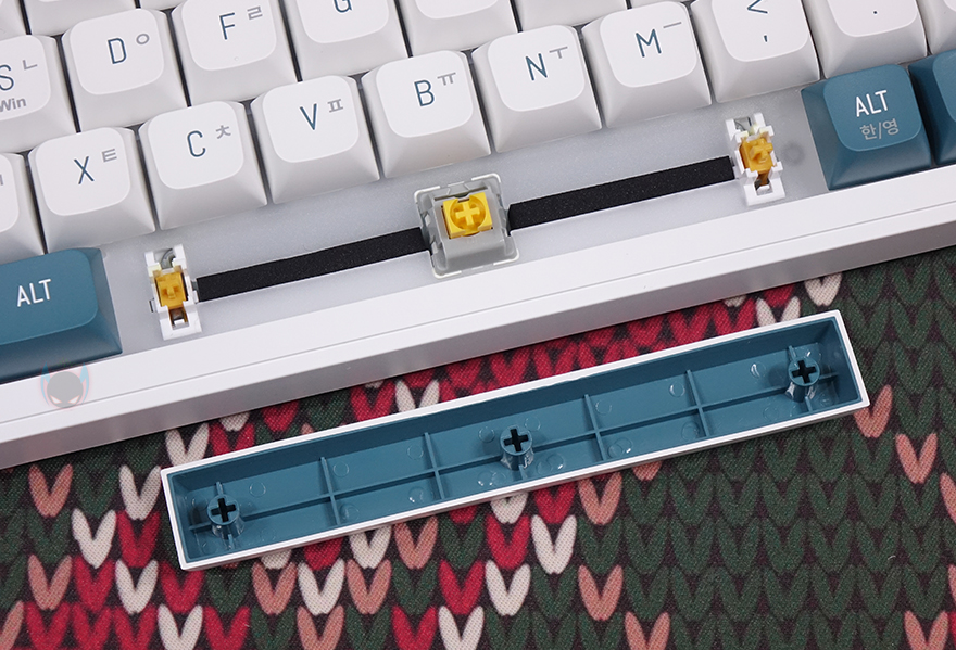 키캡 경우 앞서 언급한 색상에 따라 투톤 컬러로 적용되어 있으며, 키캡은 모두 PBT 재질에 바깥쪽과 안쪽이 100% 겹쳐지는 이중사출 방식입니다. 또한, 앞서 구성품에서 확인한 추가 교체용 키캡을 사용하면 투톤에서 3가지 컬러로 변경해서 사용할 수 있죠. 스페이스-바 같은 긴 키들의 스테빌라이저는 체리식이며, 윤활처리도 기본 적용되어 있습니다. 그리고, 스위치 같은 경우 표면에 DF라고 표기된 것을 확인할 수 있어서 자체 스위치임을 알 수 있고, 옐로우 색상에 황축이며 리니어 타입입니다. 또한, 요즘 트렌드에 맞춰 스위치는 분리할 수 있는 핫스왑 방식이며, 스위치를 분리하면 내부 구조를 간접적으로 조금 확인할 수 있는데, DF98 키보드 역시 개스킷구조와 함께 소음을 줄이도록 실리콘 재질의 패드와 흡음재가 적용되어 있습니다. 그래서, 98 키 배열임에도 1kg대 무게를 가졌죠. 그리고, 스위치 고정 PCB부분은 5핀 방식이라 3핀과 5핀 모두 호환이 가능해 다른 스위치로 교체해서 사용할 수 있습니다.