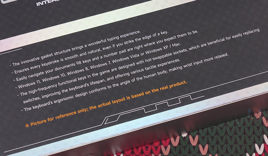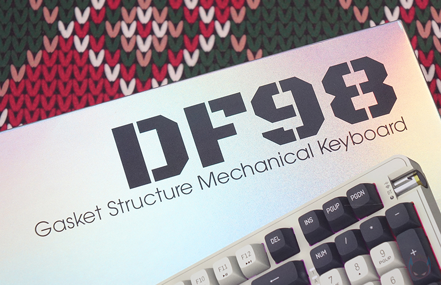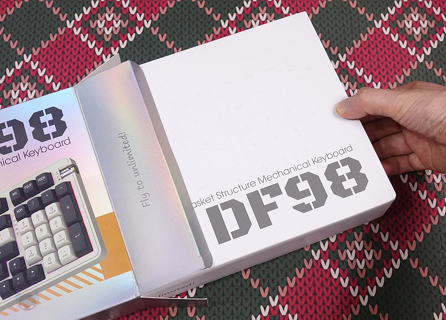 제품 패키지는 박스 형태로 일단 박스 전체까지 포장처리되어 있어서 소비자 입장에선 좀 더 판매제품에 신뢰를 가질 수 있습니다. 그리고, 박스 디자인에도 꽤나 신경을 썼는데, 배경은 홀로그램처럼 빛 반사에 따라 색상이 다르며, 전면에는 모델명과 함께 제품 이미지 2개를 담고 있는데 DF98 키보드는 2가지 컬러로 출시되었죠. 또한, 전면에 주요 특징으로 개스킷(Gasket) 구조, 핫스왑 스위치, ARGB 효과를 표기해놨는데, 참고로 현재 출시된 DF98은 ARGB 효과가 없습니다. 이는 측면에 제품 구분 표시에서 확인할 수 있어서, ARGB 모델이 추후 나올 가능성도 짐작할 수 있죠.