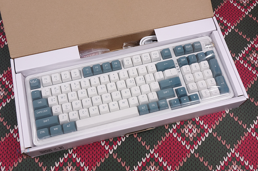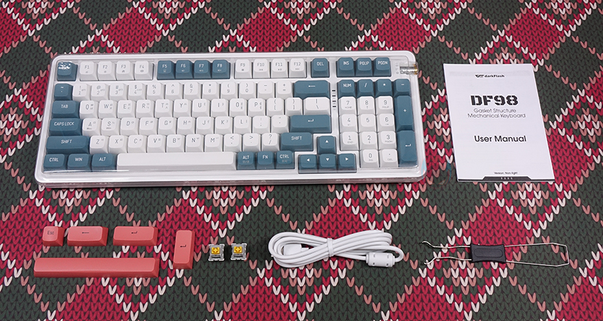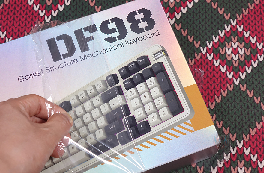 박스를 열어보면, 속박스가 하나 더 들어간 포장상태를 확인할 수 있으며, 속박스를 열어보면, 비닐포장에 DF98 키보드가 포장된 것을 확인할 수 있죠. 제품 구성은 DF98 키보드, 제품 설명서, 추가 교체용 포인트 키캡, 여분의 스위치, USB 전원 및 충전 케이블, 키캡&스위치 리무버 제공으로 이루어져 있습니다. 그리고, 키보드 덮개로 얇은 루프도 포장에 적용되어 있습니다.