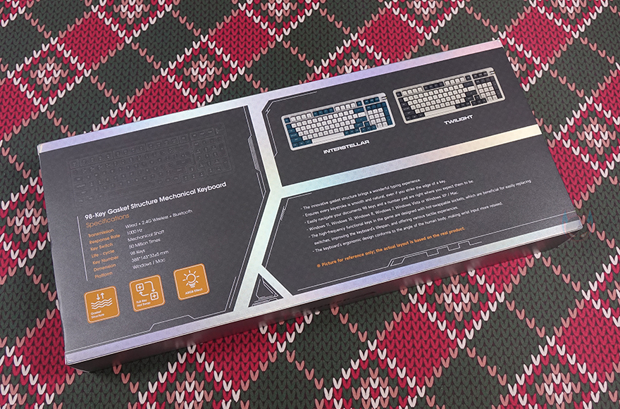 박스 후면에서 전면에서 확인한 DF98 키보드 이미지 2가지 컬러 제품에 대한 이름을 확인할 수 있는데, 인터스텔라와 트와일라잇입니다. 그리고, 아래에는 제품의 주요 특징을 좀 더 상세하게 더 많이 언급하고 있으며, 왼쪽에는 제품의 기본 사양 표기를 확인할 수 있죠. 뒤에서 모두 언급하겠지만, DF98 키보드 역시 유무선 3가지 연결방식과 모델명처럼 98키 배열이라는 걸 미리 알 수 있습니다.