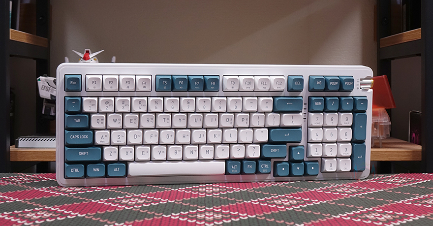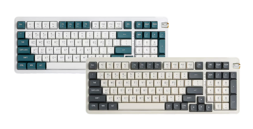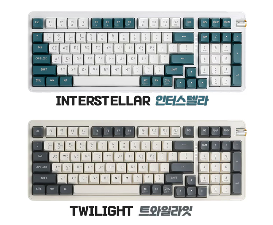 본격적으로 다크플래쉬 DF98 기계식 키보드를 살펴보면, 색상은 앞서 언급하고 확인했듯이 2가지 컬러인 인터스텔라와 트와일라잇으로 출시되었습니다. 인터스펠라는 키보드색상에서 보기 드문 청록색과 화이트 조합이고, 트와일라잇은 블랙과 아이보리 컬러 조합이죠. 키보드 무게는 약 1kg이며, 총 키 수는 98키로 키보드 전체 사이즈가 일반 104 키 풀-배열보다 조금 작죠. 최근 키보드 트렌드 중 하나가 이런 100 키이하로 나오는 경우가 많습니다.