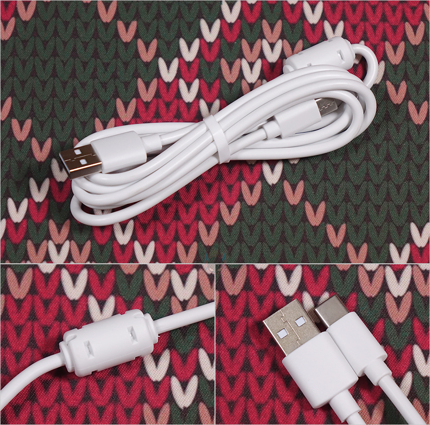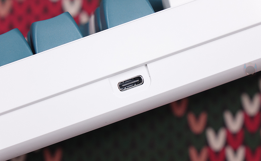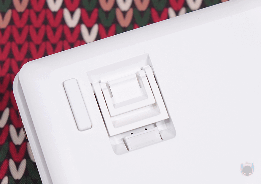 그리고, 키보드 전면 한쪽에는 충전 및 유선시 사용되는 USB 케이블과 연결되는 USB 타입C 포트가 배치되어 있으며, 키보드 밑바닥 부분에는 모서리 부근으로 미끄럼방지 패드가 기본 부착되어 있으며, 앞부분에는 2단 높낮이조절 받침대도 적용되어 있는데, 받침 부분에도 모두 패드가 기본 부착되어 있죠. 또한, 받침대 한쪽에는 무선 2.4G 사용 시 이용되는 동글이 수신기가 수납되는 공간이 있습니다. 높낮이 받침대가 적용되었기 때문에 키보드 측면에서 보면 타이핑에 최적화라 불리는 스텝-스컬처 2 단계배열 확인과 함께 사용자가 원하는 높이로 선택해 사용할 수 있죠. 끝으로, USB 전원 및 충전케이블은 약 1.5m 길이에 신호손실을 줄이도록 노이즈 필터가 적용되어 있으며, USB Type-A to C 인터페이스를 가졌습니다.