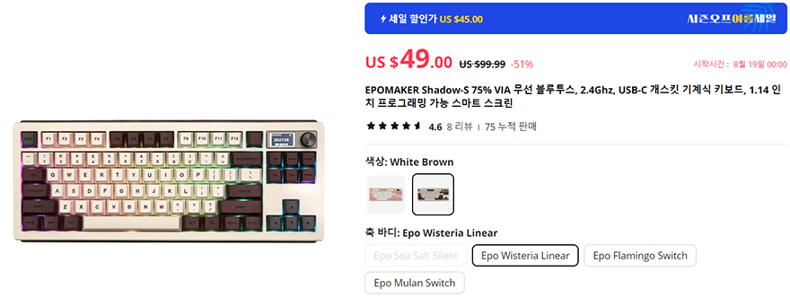 글로벌 키보드 샵 브랜드 중 하나인 에포메이커는 국내 소비자들에게 RT100 키보드와 함께 많이 알려졌다. 특히, 이후로 국내 소비자들에게 적극적으로 다가가기 위해 쿠팡 입점도 했으며, 알리익스프레스에는 예전부터 공식 스토어로 입점해 자사 브랜드 제품들을 가장 먼저 만나볼 수 있다. 이번에 출시한 텐키리스 버전의 Shadow-S 역시 최신 제품으로 텐키리스 크기에 1.14인치 디스플레이를 적용하고, VIA 지원을 갖춘 것이 특징이다. 물론, 요즘 기계식 키보드 트랜드도 모두 갖추고 있다. 이번에 저렴하게 판매되니 관심있었다면 놓치지 말자.