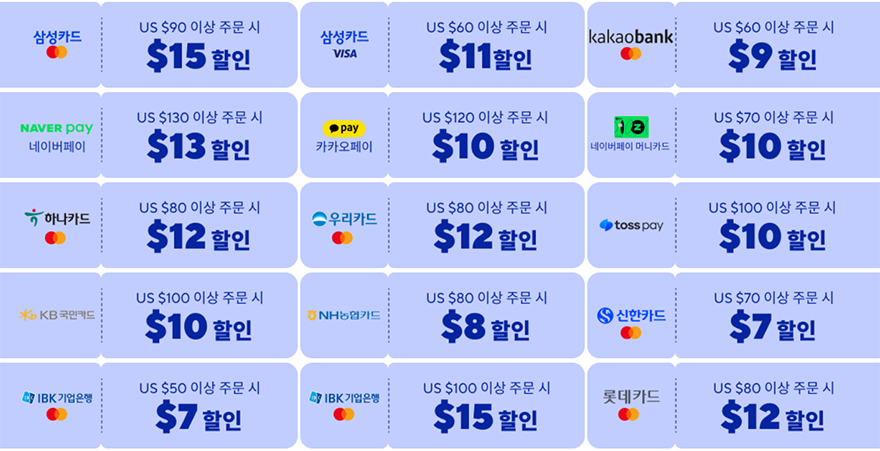 6월에 있었던 여름 시작세일과 마찬가지로 8월은 여름 끝나는 세일로 역시 대규모 진행되는데, 결제할인인 페이와 카드사 종류가 올해 역대급으로 가장 많다. 가장 큰 결제할인은 삼성카드와 IBK 기업은행이며, 나머지 페이와 카드사들도 대부분 10달러이상으로 지원해주고 있어서 그 어느때보다 결제할인 소진이 빠를 것으로 판단된다. 물론, 프로모션 할인코드도 함께 제공되기때문에 함께 사용해야 평소보다 가장 저렴하게 구입할 수 있다. 또한, 이번 행사에선 삼성 브랜드 제품에만 사용할 수 있는 할인코드도 별도로 제공된다. 결제할인과 할인코드 정보는 아래와 같다.