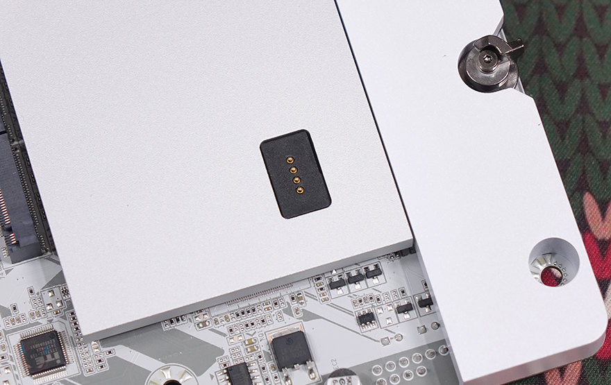 CPU 소켓 주변의 전원부는 당연히 방열판이 장착되어 있는데, 백패널 I/O 방향과 가까이 있는 AORUS STEALTH 문구가 있는 화이트부분은 자석방식으로 분리가 됩니다. 재질은 메탈이고, 분리하면 안쪽에 AORUS 로고 부분에 RGB 효과를 볼 수 있도록 PCB기판이 장착된 것을 확인할 수 있어서, 일종의 커버 역할을 하는 셈인데, 자석방식으로 장착할 수 있는 부위라 경우에 따라서 소비자가 커스텀 디자인한 DIY 커버를 적용할 수 있는 활용성도 열려있다 할 수 있죠.