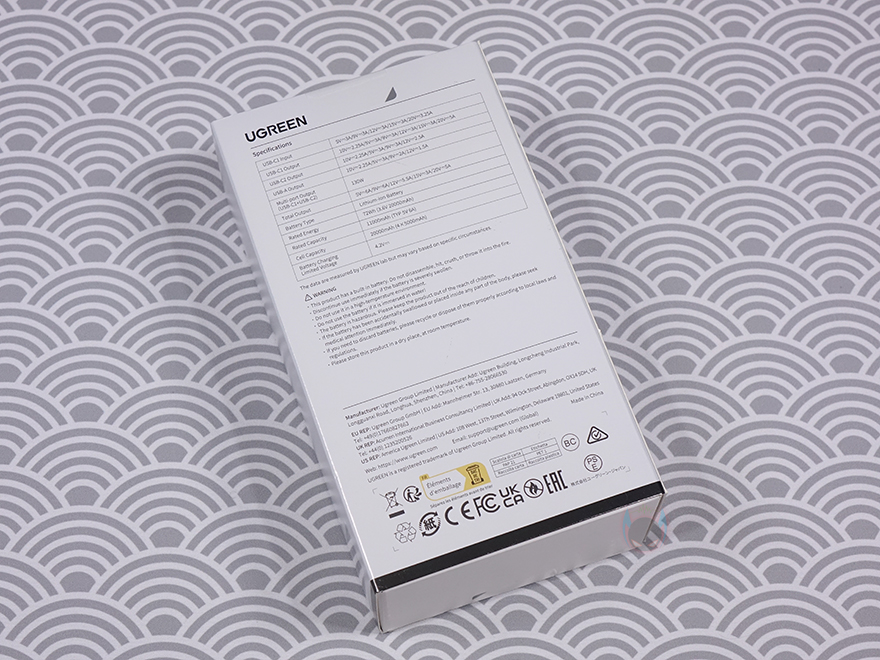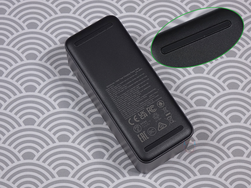 오른쪽 측면에는 버튼이 하나 배치되어 있는데, 바로 전원 버튼으로 버튼 옆에 문구처럼 단순 전원 버튼 기능만 하는게 아니라 추가 기능도 갖추고 있습니다. 이 부분은 뒤에서 다시 언급하죠. 그리고, 반대쪽 측면에는 총 출력과 배터리 용량 표기를 확인할 수 있으며, 후면에는 포트별 전력 출력과 입력 지원을 확인할 수 있는데, USB 타입 C 1번 포트 같은 경우에는 출력 시 최대 100W까지 지원하며, 보조배터리 충전 즉 입력 시에는 최대 65W로 충전됩니다. 또한, 후면에는 미끄럼방지를 위해 위아래 고무패드도 기본 부착되어 있죠. 끝으로, 기본 제공되는 USB 충전 케이블은 약 50cm 길이에 USB Type-C to C 인터페이스를 가졌습니다.