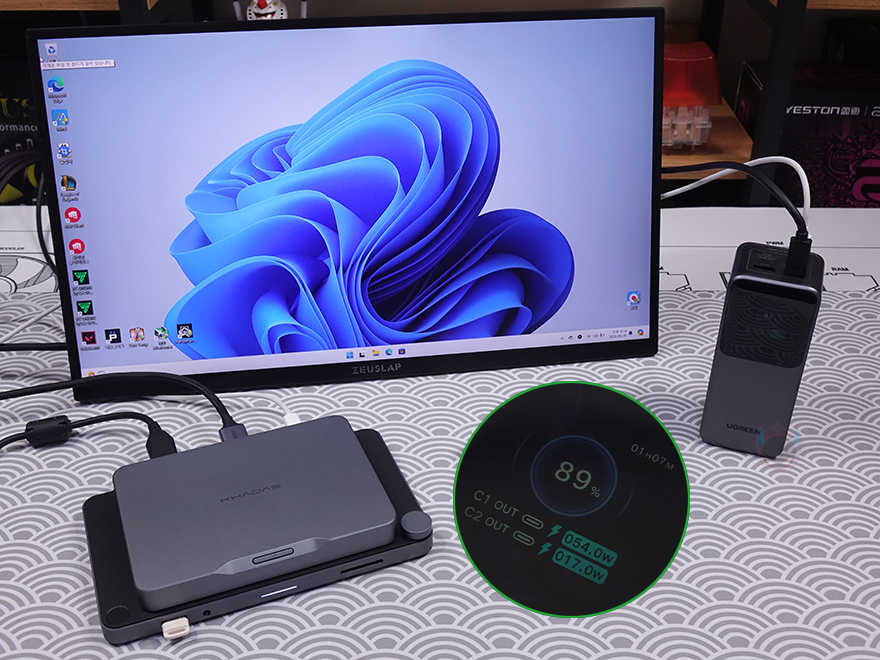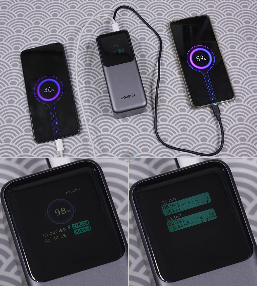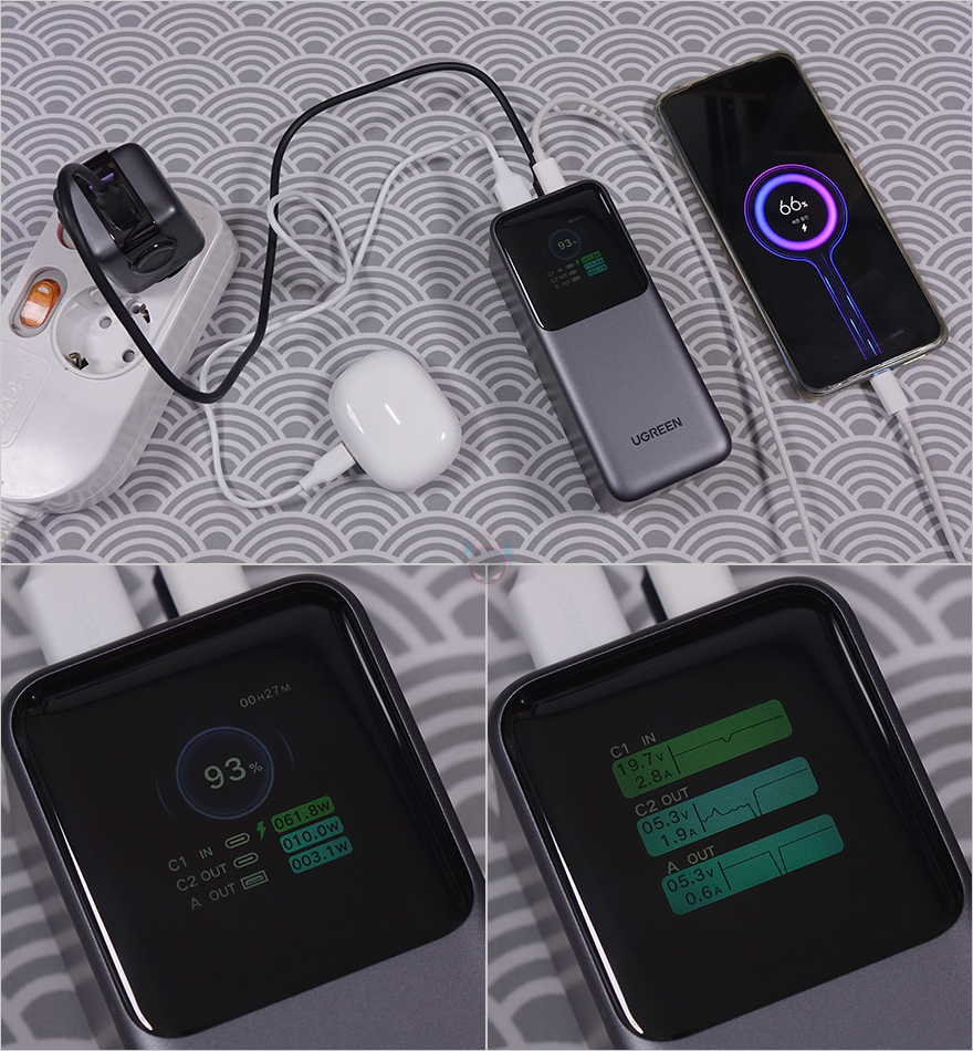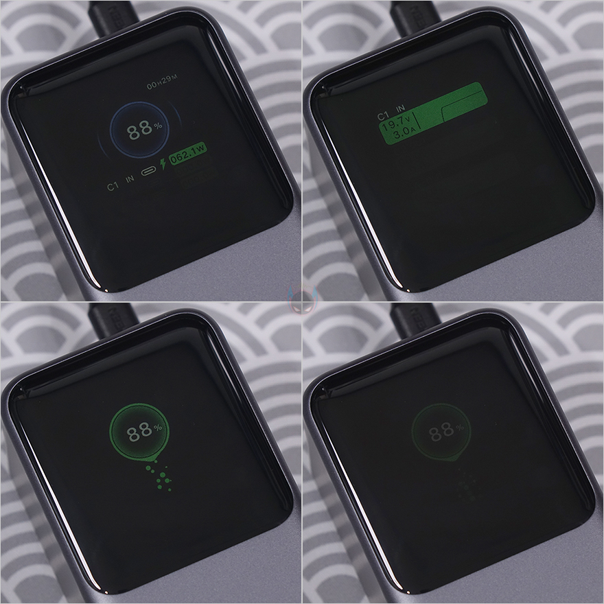 여기에 Nexode 130W는 총 130W 출력을 지원하고, USB 타입C 1번 포트는 최대 100W, 타입 C 2번 포트는 최대 30W까지 지원하기 때문에, 사용환경에 따라선 미니 PC 시스템 비상 배터리로도 충분히 사용이 가능합니다. 즉, 미니 PC 본체와 포터블 모니터까지 연결해서 사용이 가능하죠. 완충상태에선 1시간 이내 대기 모드 및 사용할 수 있습니다. 그리고, Nexode 130W 보조배터리를 충전할 때는 65W로 충전되는데, 이때도 역시 디스플레이 화면에서 입력 방식으로 작동되는 충전속도와 전압/전류 그래프를 확인할 수 있죠. 또한, Nexode 130W 보조배터리를 충전하고 있는 상태에서도 외부 디바이스를 충전할 수 있으며, 디스플레이 화면에서도 각각 입력과 출력 상태를 동시에 보여줍니다.