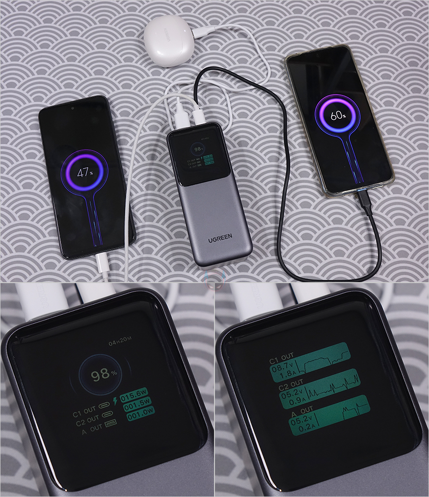 그리고, Nexode 130W 보조배터리로 외부 디바이스 장치들을 충전해보면, 충전에 사용되는 포트는 바로 화면에서 충전속도를 확인할 수 있습니다. 또한, 충전 작동일 때 전원 버튼을 한 번 누르면 전압과 전류 표기와 함께 실시간 그래프 형태로도 볼 수 있습니다. 물론, 충전 포트가 총 3개이기 때문에 사용하는 포트에 맞춰서 모두 화면에 보여주죠. 기존에 보조배터리들은 충전 속도나 단순 전압/전류 표기까지는 있었지만, 그래프 방식까지 나오는 경우는 매우 드물고, 유그린에서도 첫 제품이죠. 여기에 무선이어폰이나 스마트워치 같은 저전력으로 충전하는 디바이스 제품들도 앞서 언급했듯이 전원버튼을 3초 이상 누르면, 화면에 왼쪽에 ^ 표시가 나오면서 저전력 모드로 충전할 수 있으며, 퍼센트 잔량 표기 오른쪽 위에는 실시간으로 몇 시간 사용할 수 있는지도 표시해 줍니다. 또한, 전원 버튼을 30초 이상 건드리지 않으면 자동으로 디스플레이 화면은 로봇 이모티콘 화면으로 바꿔 디스플레이에 따른 배터리 소모도 줄이도록 했으며, 추가로 30초 이상 또 건드리지 않으면 화면 밝기도 자동으로 줄이죠.