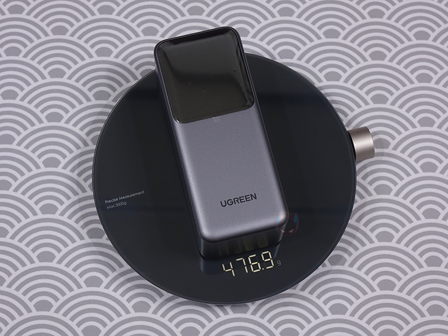 그럼, 본격적으로 유그린(UGREEN) Nexode 130W 보조배터리를 살펴보는데, 무게는 약 477g으로 조금 묵직한 편이지만, 크기가 스마트폰보다 조금 작은 편이라 휴대성으로는 크게 부담되는 무게는 아닙니다. 물론, 두께가 있기 때문에 가방에 휴대하기에 적합하죠. 전면에는 앞서 제품 박스에서 이미지로 미리 확인했듯이 디스플레이가 적용되었는데, 개봉 시에는 보호비닐이 부착되어 있습니다. 그리고, 디스플레이 방향 상단에는 USB 충전 포트가 배치되어 있죠. 포트는 총 3개 USB 타입 C 포트 2개, 타입 A 포트 1개로 USB 타입 C 1번 포트는 입/출력 둘 다 지원해 외부 충전뿐만 아니라 Nexode 130W 보조배터리를 충전할 때도 사용됩니다. 그리고, 포트 옆에 출력 표기로 최대 100W라고 표기된 것을 확인할 수 있죠.