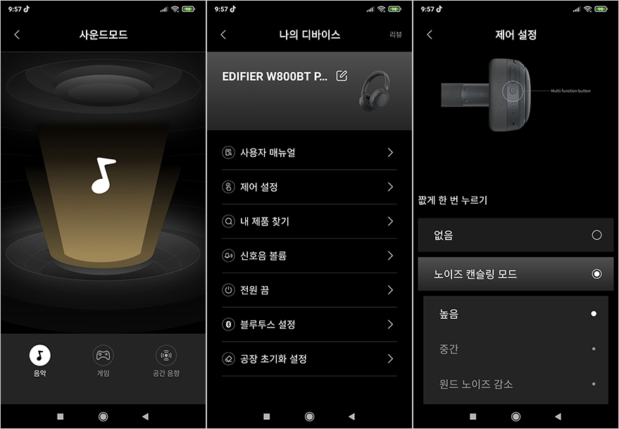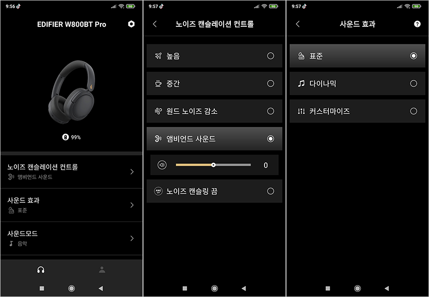 W800BT Pro 역시 글로벌버전 제품 같은 경우 에디파이어의 공용앱 ConneX를 지원합니다. 블루투스 무선 연결이 정상적으로 이루어지면, 앱에서 자동으로 제품을 인식하고, 메인화면에서 배터리 잔량과 함께 노이즈 캔슬레이션 컨트롤, 사운드 효과, 사운드 모드 메뉴를 확인할 수 있죠. 노이즈 캔슬레이션 컨트롤은 ANC와 주변 소음 모드인 앰비언드 사운드 조절을 할 수 있으며, 사운드 효과에는 표준, 다이내믹, 커스터마이즈 3가지 모드를 지원하고, 사운드 효과에는 음악/게임/공간음향 3가지 모드를 지원합니다. 이 밖에도 디바이스 설정에서 이어 컵의 버튼 기능을 설정할 수 있게 제어 설정과 연결음이나 버튼시 작동음을 조절할 수 있는 신호음 조절, 예약종료 설정도 할 수 있죠.