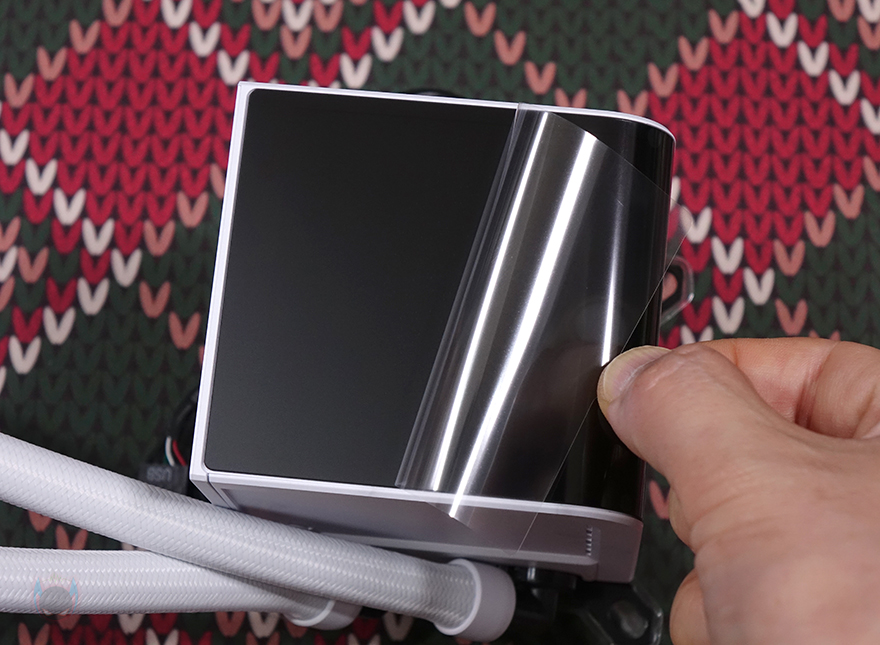 그리고, 시작에서 잠깐 언급했듯이 PANORAMA(파노라마) 시리즈가 출시전부터 주목을 받은 핵심 부분은 워터블록에 있는데, 바로 디스플레이가 적용되었기 때문입니다. 물론, 요즘 다른 쿨러 제품들에서도 디스플레이 적용을 많이 볼 수 있습니다. 그래서, PANORAMA 시리즈는 일반적인 평면 디스플레이가 아니라 곡면(Curved) 디스플레이를 적용했죠. 그것도 단순한 LED 디스플레이가 아닌 스마트폰에 많이 적용되는 AMOLED 디스플레이를 적용했습니다. 이는 현재 시중에 판매되는 일체형 수랭쿨러 중에 유일한 제품이죠. 개봉 시에는 보호비닐이 부착되어 있으며, 90˚ 곡면을 가진 AMOLED 디스플레이 크기는 6.5인치로 이 역시 지금까지 출시된 쿨러들 중 가장 큰 화면을 적용한 것으로, 단순히 숫자로만 언급하면 실감이 안들 수 있는데, 요즘 스마트폰 화면 크기가 6.5~6.7인치이기 때문에 그냥 스마트폰 화면을 곡면으로 적용했다고 보면 됩니다. 여기에 AMOLED 디스플레이가 적용된 만큼 빛반사가 적은 글레어와 2K@60Hz 해상도를 갖추고 있습니다. 화면 상단에도 패널과 해상도 표기를 확인할 수 있죠.