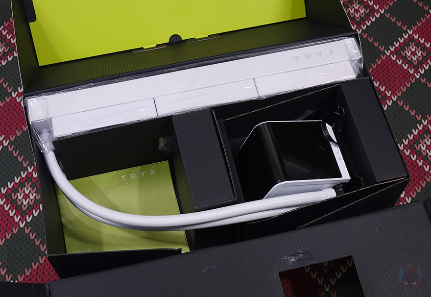 라디에이터는 일반적인 27mm 두께보다 3mm 더 두꺼운 30mm 두께를 가졌으며, 측면에는 TRYX 로고를 새겨놨고, 방열핀들은 촘촘하면서 손상없이 잘 정렬 배치되어 있습니다. 라디에이터와 워터블록을 연결하는 튜브(Tube)는 총 40cm 길이에 전체 슬리빙 처리가 되어 있으며, Asetek 8세대 냉각 솔루션 기술이 적용되었기 때문에 이전 세대들보다 약 40% 두꺼운 튜브로 유량과 유속을 증가시켰습니다. 또한, 라디에이터와 워터블록 연결부도 누수가 발생하지 않게 깔끔하게 마감처리되어 있죠.