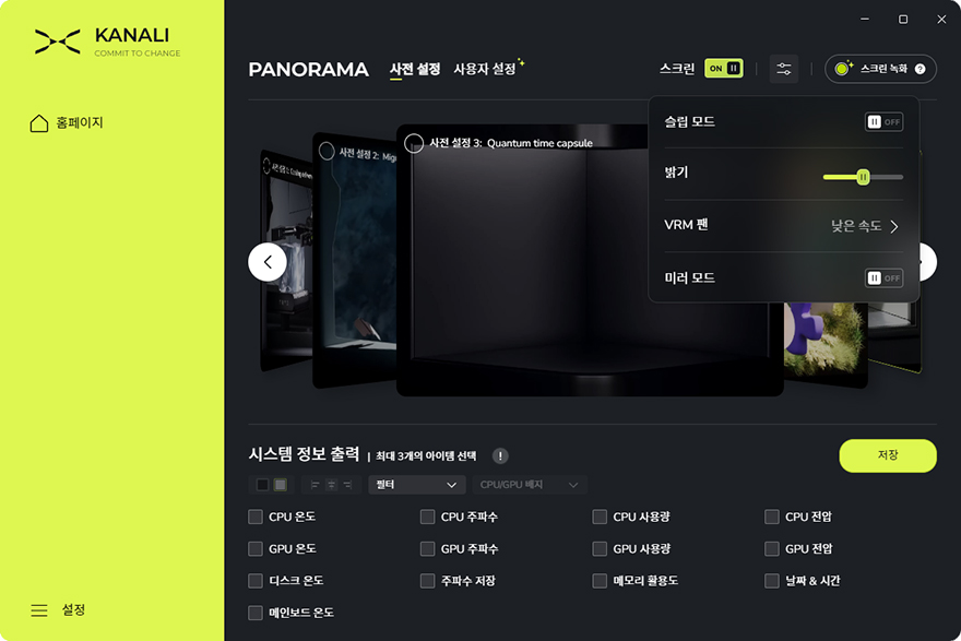 이 밖에도 스크린 On/Off 설정을 할 수 있고, 바로 옆에 설정버튼을 누르면 추가로 슬립모드, 밝기조절, VRM 팬, 미러 모드 설정을 추가로 확인할 수 있는데, VRM 팬은 펌프 속도조절로 총 4가지 속도 모드를 제공해주고 있으며, 각 모드에서 스마트 모드와 고정 모드로 선택해서 사용할 수 있습니다. 물론, RPM 설정도 할 수 있죠. 또한, 프로그램 설정으로 들어각면 언어 설정을 비롯해 온도 표시, 단축키 설정, 업데이트 등 설정을 할 수 있으며, 단축키 설정은 스크린 화면 녹화와 프로그램 창 최소화 키를 설정할 수 있습니다.