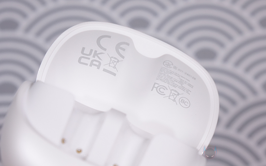 또한, 충전케이스 뚜껑 부분에 UGREEN 로고를 새겨놨고, 오픈 경계 부분 아래에는 충전이나 페어링 상태를 확인할 수 있는 LED 인디케이터가 적용되었으며, 그 아래에는 USB 충전케이블과 연결되는 USB 타입 C 포트, 바로 옆에 페어링 버튼이 배치되어 있죠. 충전케이스 후면에는 특별한 거 없이 그냥 민무늬 형태입니다. 뚜껑 부분은 대각선 방향으로 올라가면서 열리고, 일정 각도가 넘어가면 반자동으로 열리고, 닫힙니다. 케이스를 열어보면, 안에 수납된 좌우 무선 이어폰을 확인할 수 있고, 뚜껑 안쪽에는 나라별 안전 인증마크를 확인할 수 있죠.