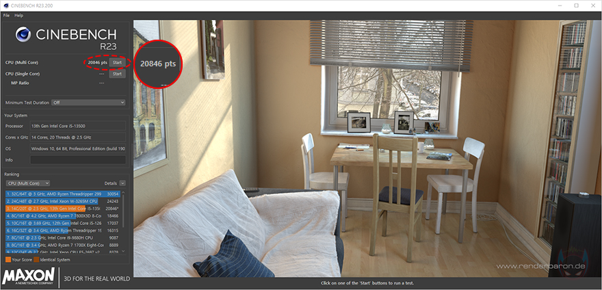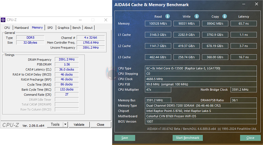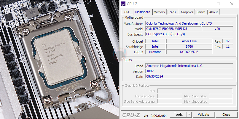 부품 지원별로 좀 더 알아보면, CVN B760I FROZEN WIFI D5 메인보드는 인텔 B760 칩셋 기반으로 인텔 12세부터 14세대 CPU까지 지원합니다. 최근 인텔 K버전 이슈가 있기때문에, 리뷰에선 인텔 13세대 i5-13500 CPU를 사용했는데, 참고로 인텔 이슈와 관련 해결 바이오스는 컬러풀에서도 이미 최신 버전(1007)으로 지원하고 있습니다. 그리고, i5-13500 CPU 성능확인을 위해 Cinebench R23을 실행해 보면, i5-13500 CPU 멀티코어 점수대인 21000점에 근접하는 것을 확인할 수 있죠. CPU 성능을 발휘하는데 충분한 뒷받침을 해주고 있습니다.