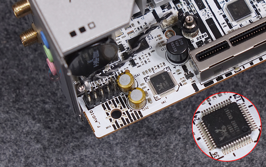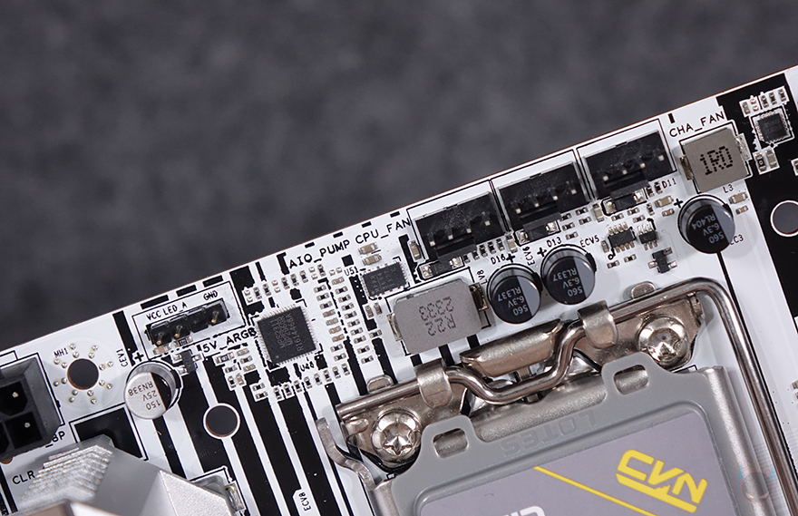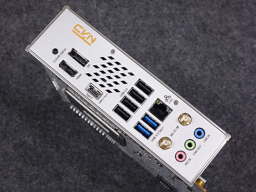 PCIe 5.0x16 슬롯 바로 왼쪽에는 내장 오디오 위치로 PC케이스 마이크/오디오 포트와 연결되는 커넥터, 그리고 오디오 칩셋에 리얼텍(Realtek)사 칩셋이 배치된 것을 확인할 수 있습니다. 끝으로, 백패널 I/O 부분을 살펴보면, 실드가 기본 장착되어 있으며, 맨 위에는 시모스 클리어(CMOS Clear) 버튼이 배치되어 있죠. 그리고, 이를 시작으로 아래로는 모니터 출력 포트에 HDMI와 DP 포트가 배치되어 있는데, 각각 2.0과 1.2 버전으로 4K@60Hz 해상도까지 지원하며, 바로 아래에는 앞서 전원부 히트싱크 안쪽에 배치된 30mm 팬을 확인했듯이 열이 배출될 수 있도록 에어홀 처리를 해놨으며, 같은 위치에 USB 3.2 Gen1 Type-C 포트가 배치되어 있습니다. 이밖에 바로 아래에는 USB 2.0(1.1) 포트 4개, 2.5G 랜(LAN) 포트, USB 3.2 Gen1 Type-A 포트 2개, Wi-Fi 6 모듈의 안테나 커넥터, 그리고, 마이크 및 오디오 잭(Jack) 포트가 배치되어 있습니다.