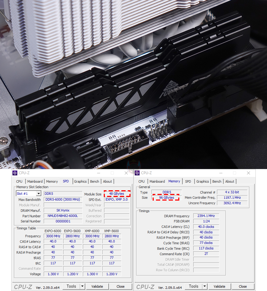 이번엔 메모리(RAM) 지원을 확인해보는데, 앞서 언급했듯이 CVN B760I FROZEN WIFI D5 메인보드는 DDR5를 지원하며, 클럭도 최대 8000MHz까지 설정할 수 있습니다. 다만, 7600MHz이상 클럭은 메모리 컨트롤 수율이 높은 K버전 CPU부터 원활하며, Non-K CPU를 사용한다면 7200~7400MHz정도가 한계라 할 수 있는데, i5-13500 CPU를 장착한 상태에서 확인한 결과 예상대로 7200MHz XMP 프로파일 메모리까지는 수월하게 오버클럭 적용되는 것을 확인할 수 있습니다. 또한, DDR5부터 생긴 단일 용량 24GB/48GB의 논-바이너리(non-binary) 메모리도 완벽하게 지원해 듀얼 슬롯에서 최대 96GB 용량을 갖출 수 있습니다.