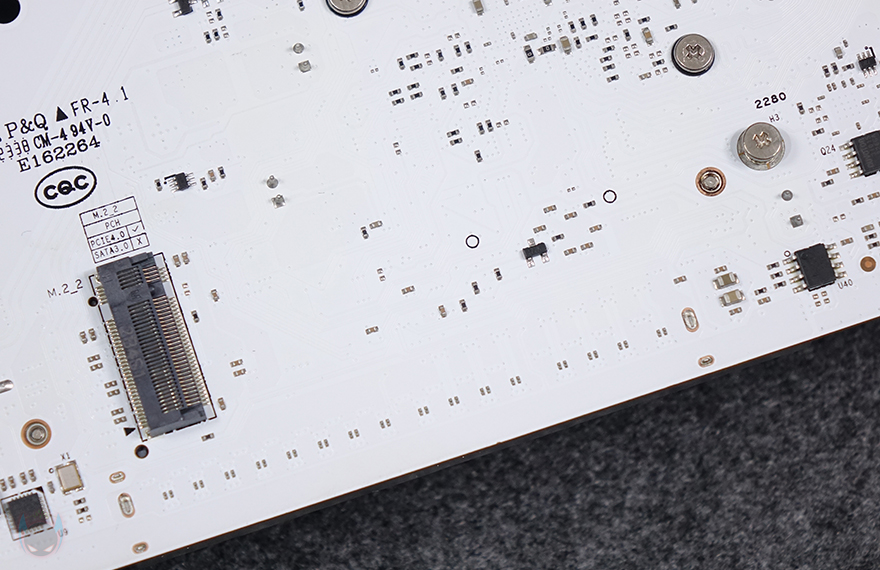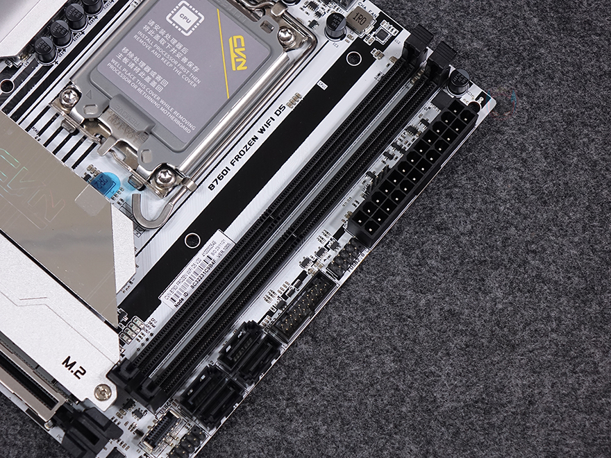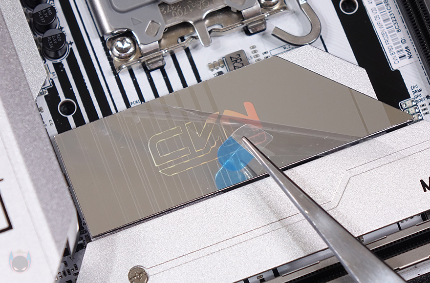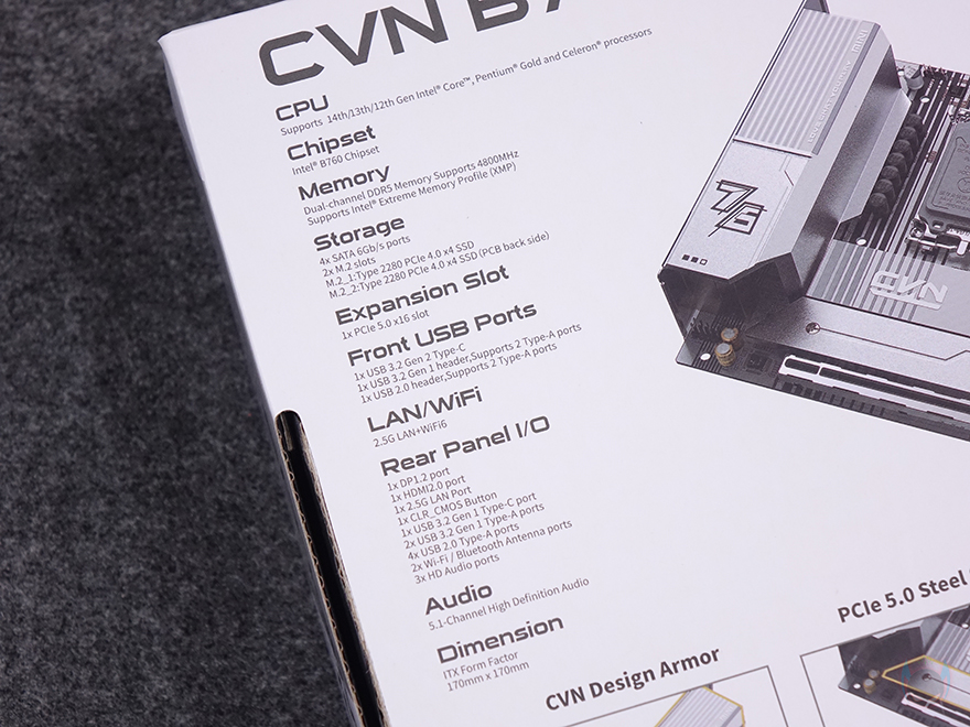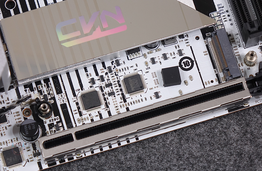 CPU 소켓 기준 바로 아래에는 인텔(Intel) B760 칩셋이 배치된 자리로 발열해결을 위해 역시 방열판(Heatsink)가 기본 장착되어 있으며, 방열판 표면에는 CVN 로고가 새겨진 홀로그램 디자인을 적용하고 있습니다. 개봉 시에는 보호비닐이 부착되어 있기 때문에 사용 전 제거를 해줘야 하며, 바로 아래에는 M.2 SSD 슬롯자리로 역시 방열판이 기본 장착되어 있으며, 방열판을 분리하면, 2280 사이즈를 장착할 수 있는 M.2 SSD 슬롯을 확인할 수 있는데, 2280 사이즈만 장착이 가능하고, 무나사 방식입니다. 물론, 방열판 안쪽에는 써멀패드(Thermalpad)도 기본 부착되어 있죠. 그리고, M.2 SSD 슬롯 아래에는 그래픽카드가 장착되는 PCIe 5.0x16 슬롯으로 내구성을 위해 스틸 아머(Steel Armor)를 적용했습니다.