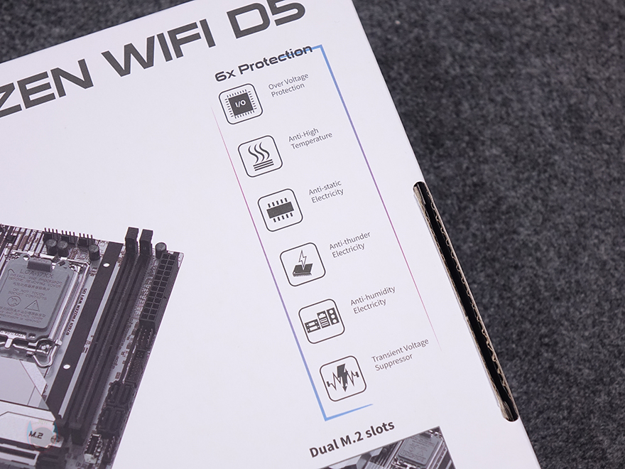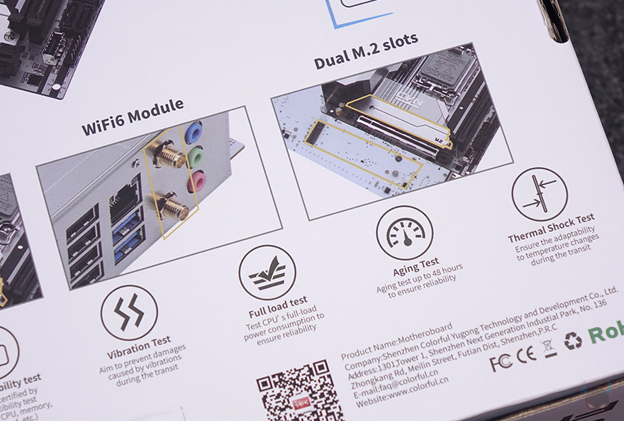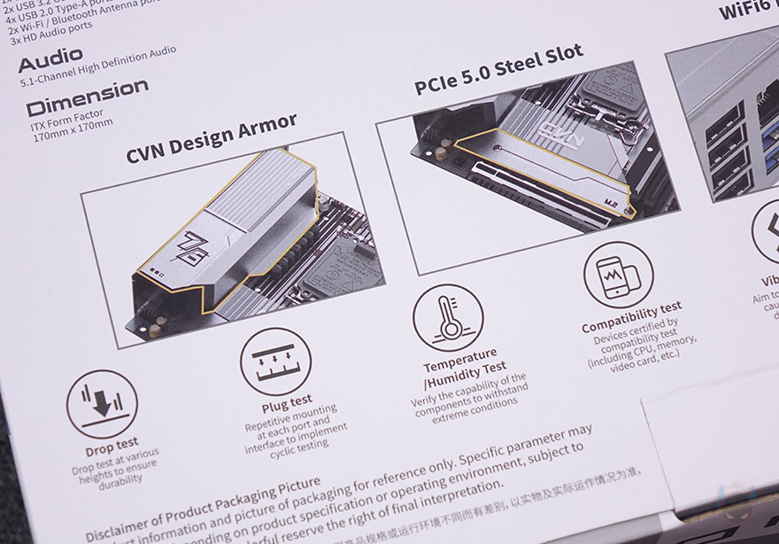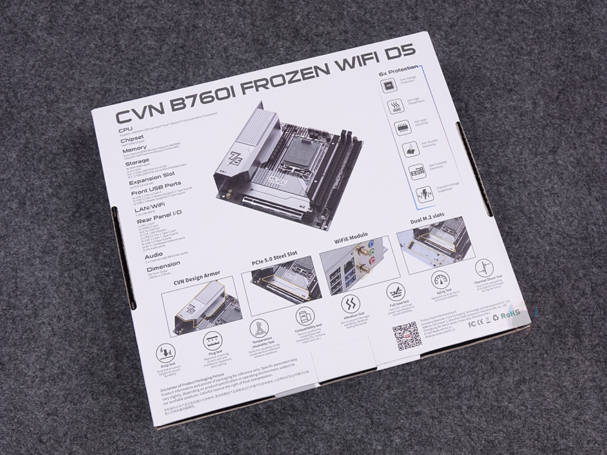 제품 패키지부터 살펴보면, ITX 메인보드 제품이기때문에 제품 박스는 작습니다. 기존에 FROZEN 라인업의 다른 제품들처럼 CVN B760I FROZEN WIFI D5 메인보드 역시 화이트 배경색에 전면에는 제품 이미지를 담고 있으며, 모델명과 인텔(Intel) B760 칩셋 적용, 최신 CPU 지원, 컬러풀의 RGB Sync 지원을 표기해 놨죠. 박스 후면에는 제품 풀샷 이미지를 기준으로 왼쪽에는 기본 사양(specification)을 표기해 놨으며, 오른쪽에는 컬러풀이 자사 메인보드에서 강조하는 6가지 보호 기술(6xProtection) 'I/O 과전압보호/고발열보호/정전기보호/낙뢰보호/습기보호/전력과부하보호' 표기를 해놨으며, 아래에는 주요 특징으로 아머 디자인(Armor design), PCIe 5.0 스틸 슬롯, Wi-Fi 6 지원, 듀얼 M.2 슬롯을 언급하고 있죠. 그리고, 그 아래에는 8가지 환경테스트 검증에 대한 표기도 확인할 수 있습니다.