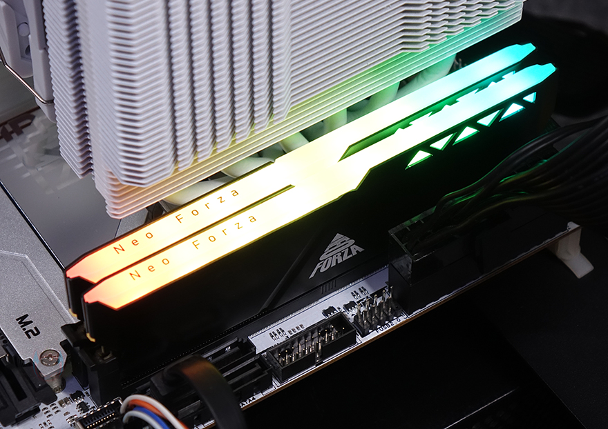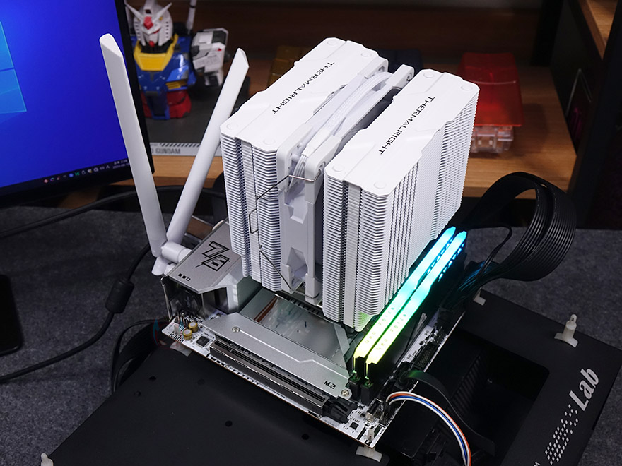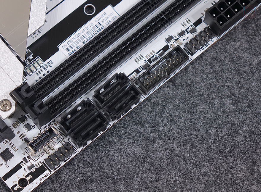 그리고, CPU 소켓 윗부분에는 5V ARGB 헤더를 비롯해 4pin PWM 커넥터가 3개 나란히 배치되어 있으며, 메모리 슬롯(Memory slot)은 ITX 규격상 2개 구성으로 DDR5를 지원하며, DDR5부터 생기기 시작한 24GB, 48GB 용량의 논-바이너리 용량도 지원하며, 최대 96GB 용량을 구성할 수 있으며, 클럭은 최신 바이오스에 따라 최대 8000MHz까지 설정할 수 있습니다. 메모리 슬롯 앞쪽에는 USB 2.0 헤더 1개와 USB 3.2 Gen1 헤더 1개, S-ATA 커넥터 4개, USB 3.2 Gen2 Type-C 1개, PC케이스 전면케이블과 연결되는 커넥터가 배치되어 있죠.
