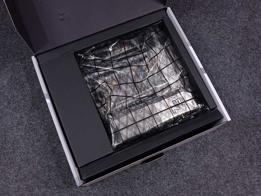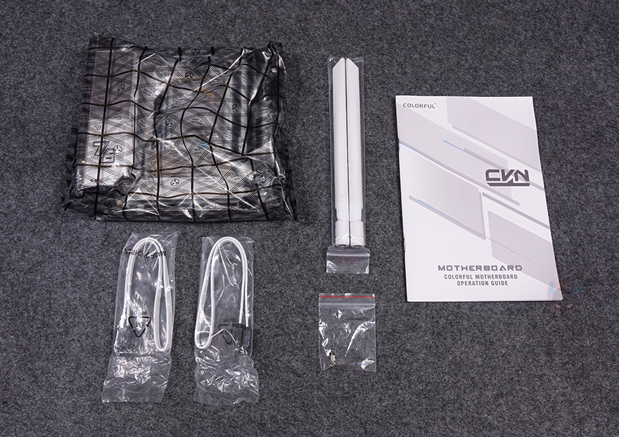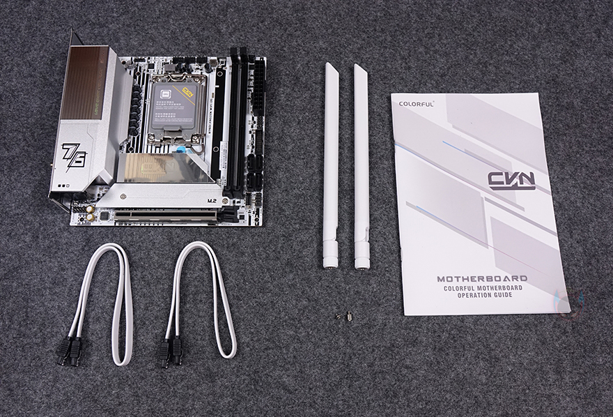 박스를 열어보면, CVN B760I FROZEN WIFI D5 메인보드를 비롯해 구성품들은 모두 비닐 포장 처리가 되어있으며, 제품 구성에는 CVN B760I FROZEN WIFI D5 메인보드, SATA 케이블 2개, Wi-Fi 안테나, M.2 SSD 나사, 제품설명서로 이루어져 있습니다.