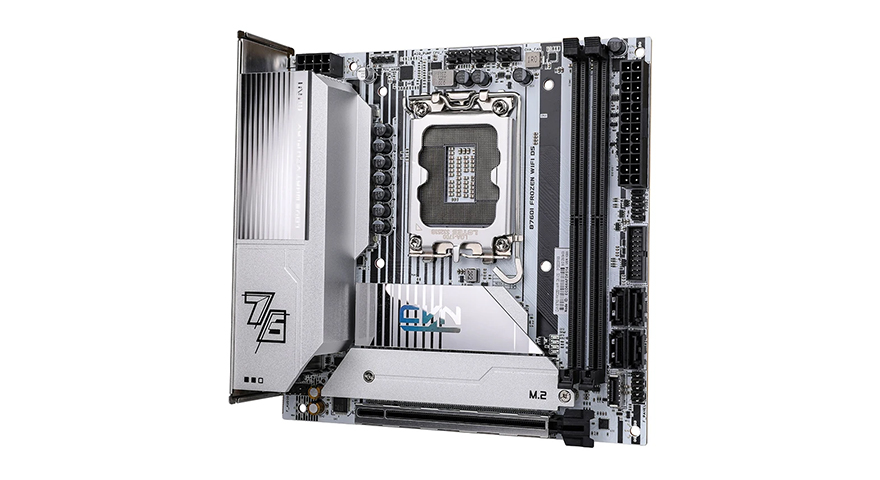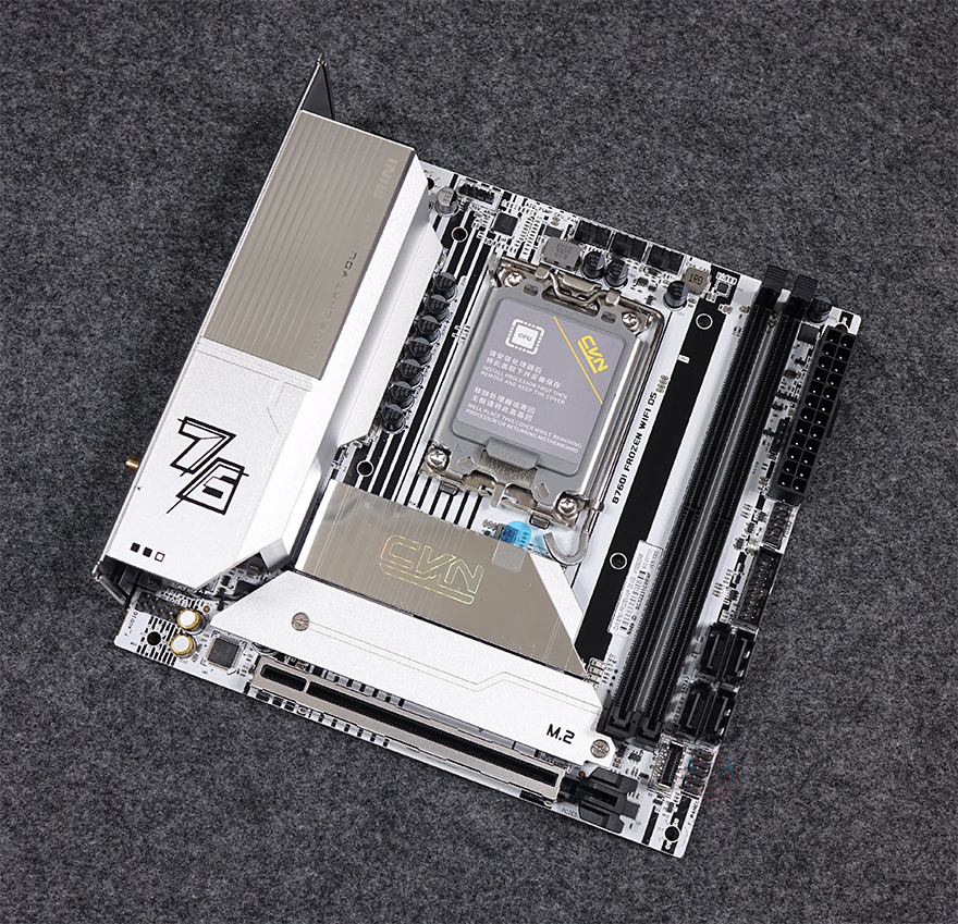 그럼, 본격적으로 컬러풀(Colorful)의 CVN B760I FROZEN WIFI D5 메인보드의 레이아웃을 살펴보는데, FROZEN 라인업답게 역시 눈에 가장 먼저 들어오는 부분은 화이트 색상(White color)입니다. 특히, PCB기판 뒷부분까지 화이트 색상이며, 기반 뒷부분에 M.2 SSD 슬롯도 미리 먼저 확인할 수 있죠. 그리고, ITX 폼 규격답게 아담한 사이즈를 가지고 있습니다.