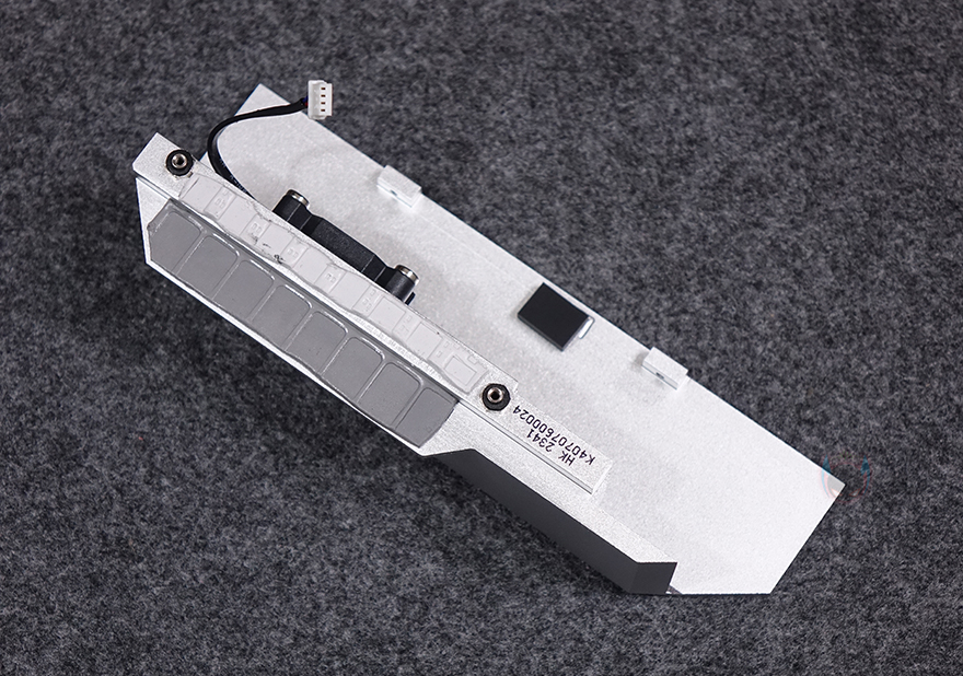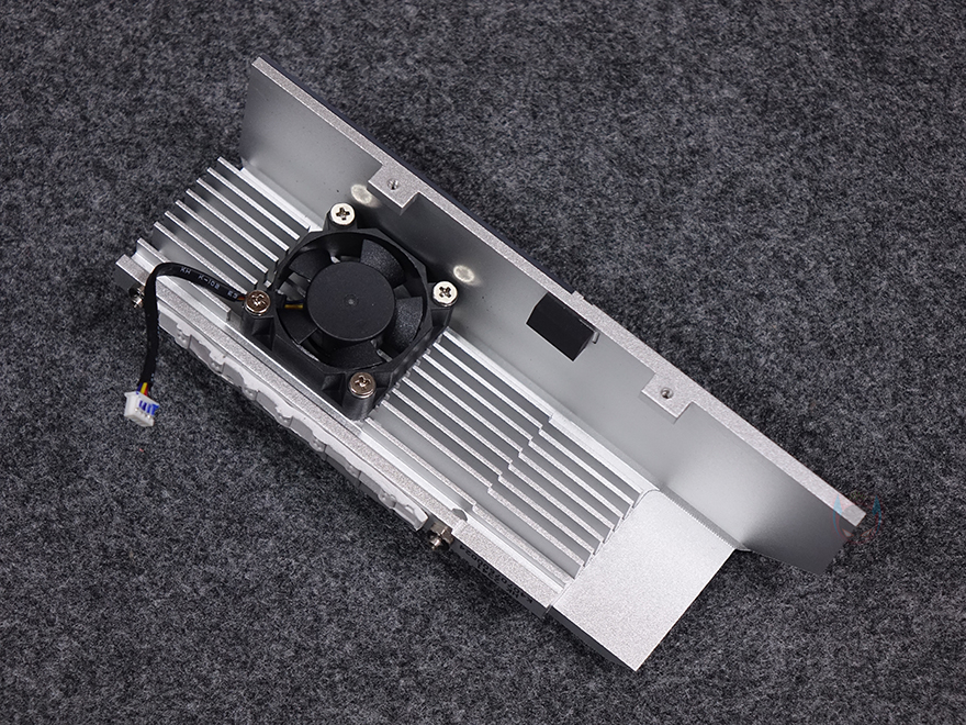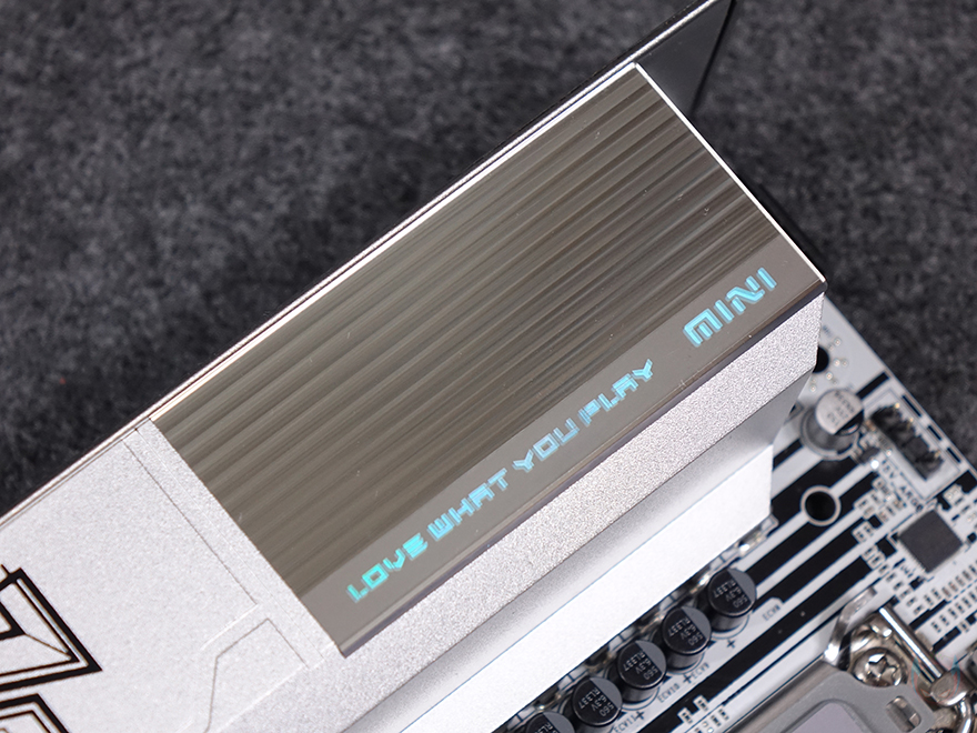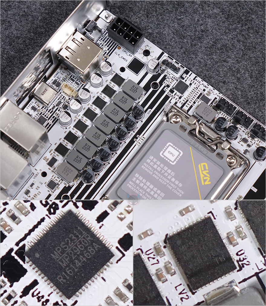 좀 더 자세히 살펴보면, 전원부에는 방열판(Heatsink)이 장착되어 있는데, B760 칩셋을 의미하는 76 숫자표기에 홀로그램 같은 디자인이 적용되어 있습니다. 방열판을 분리해보면 안쪽에 30mm 팬(Fan)이 장착되어 추가적으로 전원부 쿨링효과를 높이도록 했으며, 모스펫(Mosfet)과 초크(Choke) 부분이 맞닿는 부분에는 기본 써멀패드(Thermalpad)가 부착되어 있죠. 전원부는 7+1+1 페이즈(Phase) 구성으로 총 9 페이즈를 갖추고 있는데, 1 페이즈당 90A 전력공급으로 고급형 메인보드 부럽지 않게 갖추고 있습니다. 참고로, Dr.MOS와 PWM 칩셋은 모두 Monolithic Power Systems사 칩셋을 사용했습니다.