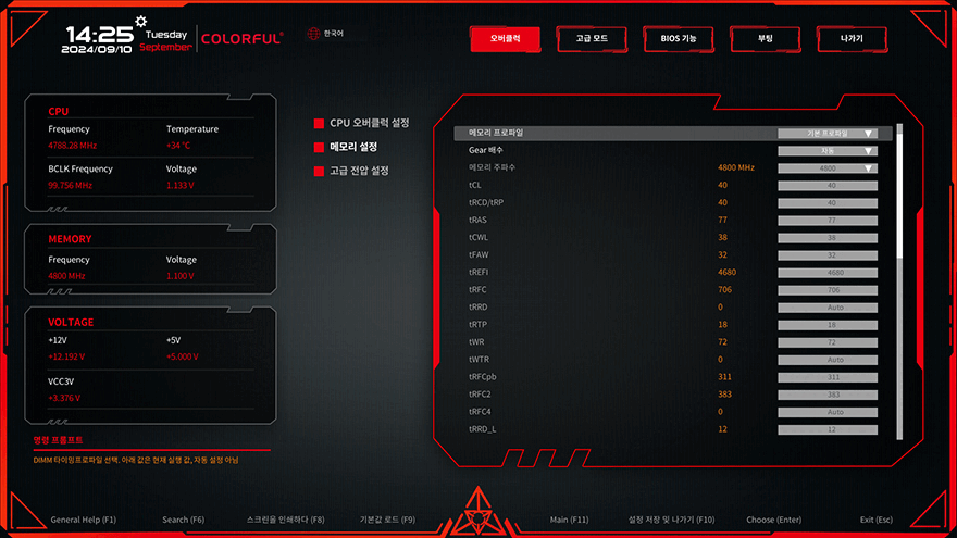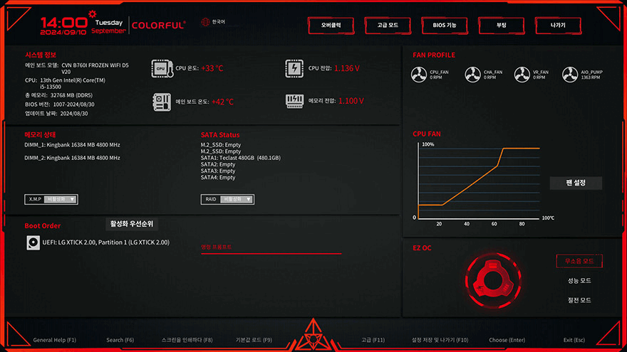 직접, 컬러풀 CVN B760I FROZEN WIFI D5 메인보드를 사용해는데, 일단 부품별 지원 및 성능을 알아보기 전에 메인보드 BIOS CMOS 메뉴를 잠깐 살펴보면, CMOS 인터페이스는 기존의 컬러풀 메인보드와 큰 차이가 없습니다. 한국어를 지원하고 있으며, 기본화면에서는 CPU와 메인보드 등의 온도와 전, 메모리, 저장장장치 상태, 팬 속도를 한눈에 모니터링할 수 있으며, 메뉴에는 오버클럭(Overclock), 고급모드(Advanced), 바이오스 기능(Bios setting), 부팅(Boot), 나가기(Exit) 5가지입니다.